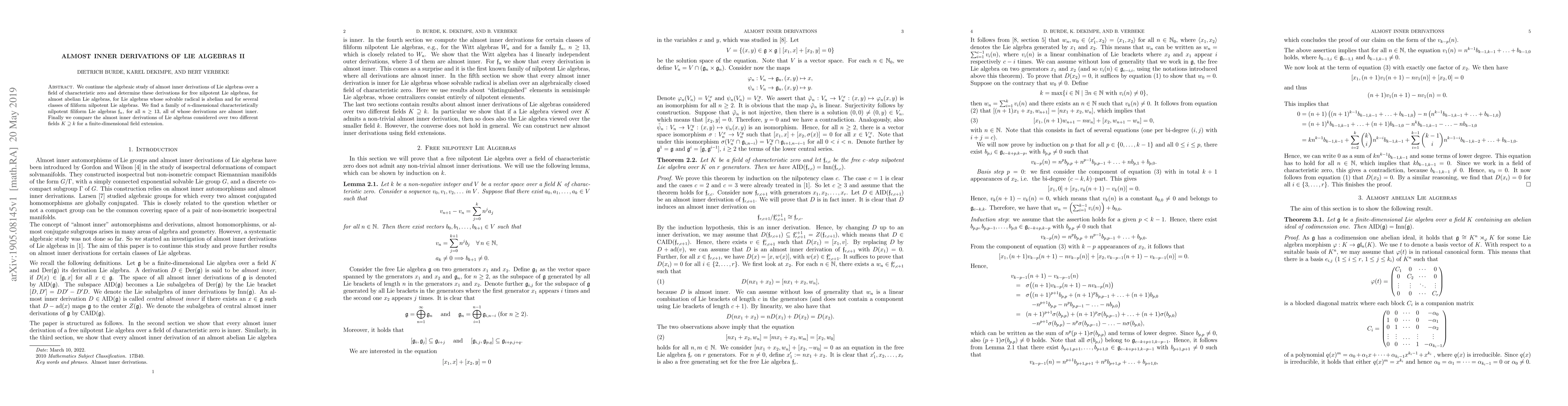 We continue the algebraic study of almost inner derivations of Lie algebras over a field of characteristic zero and determine these derivations for free nilpotent Lie algebras, for almost abelian Lie algebras, for Lie algebras whose solvable radical is abelian and for several classes of filiform nilpotent Lie algebras. We find a family of $n$-dimensional characteristically nilpotent filiform Lie algebras $\mathfrak{f}_n$, for all $n\ge 13$, all of whose derivations are almost inner. Finally we compare the almost inner derivations of Lie algebras considered over two different fields $K\supseteq k$ for a finite-dimensional field extension.