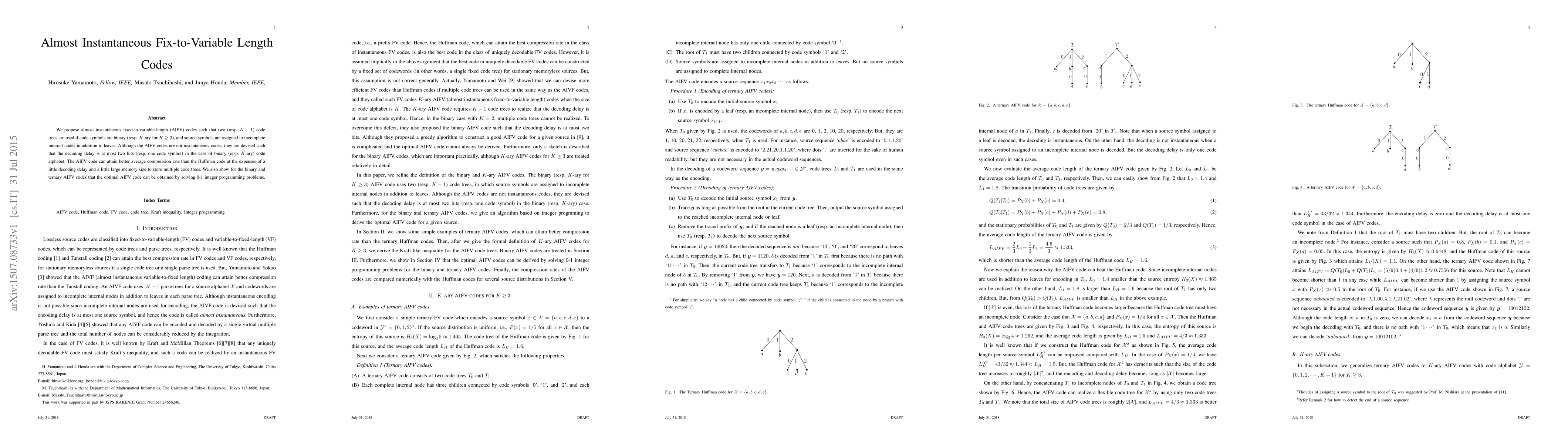 This paper proposes almost instantaneous fixed-to-variable-length (AIFV) codes that use two or multiple code trees to achieve better average compression rates than Huffman codes, with a decoding delay of at most two bits or one code symbol, and a slightly larger memory size to store the code trees. The optimal binary and ternary AIFV codes can be derived by solving 0-1 integer programming problems.