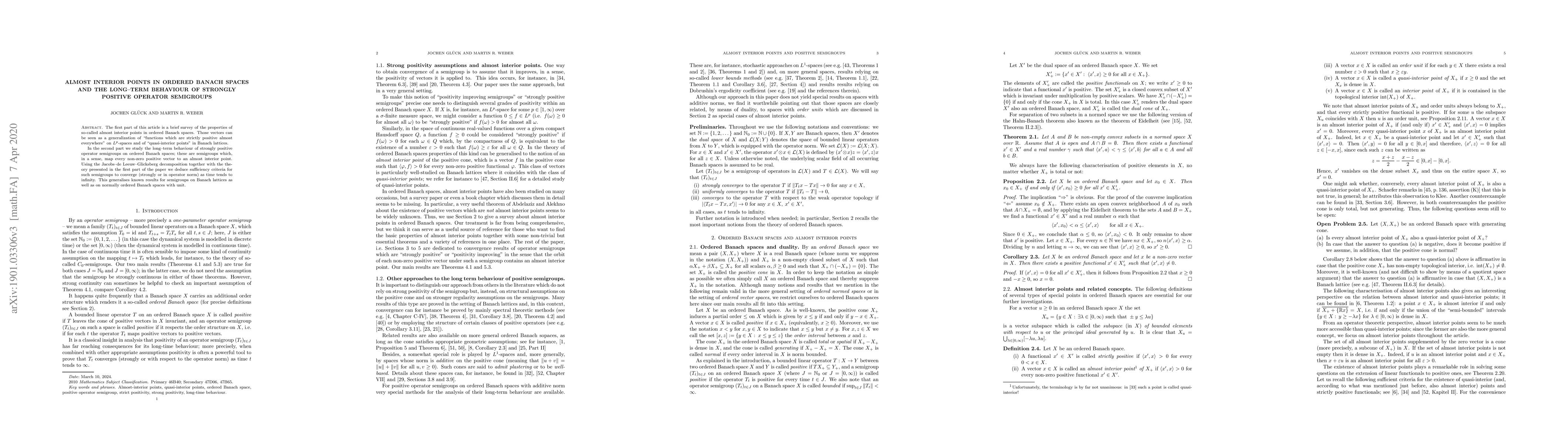 This paper surveys the properties of almost interior points in ordered Banach spaces and explores the long-term behavior of strongly positive operator semigroups on these spaces. It provides sufficiency criteria for such semigroups to converge strongly or in operator norm as time approaches infinity, generalizing existing results for Banach lattices and normally ordered Banach spaces with unit.