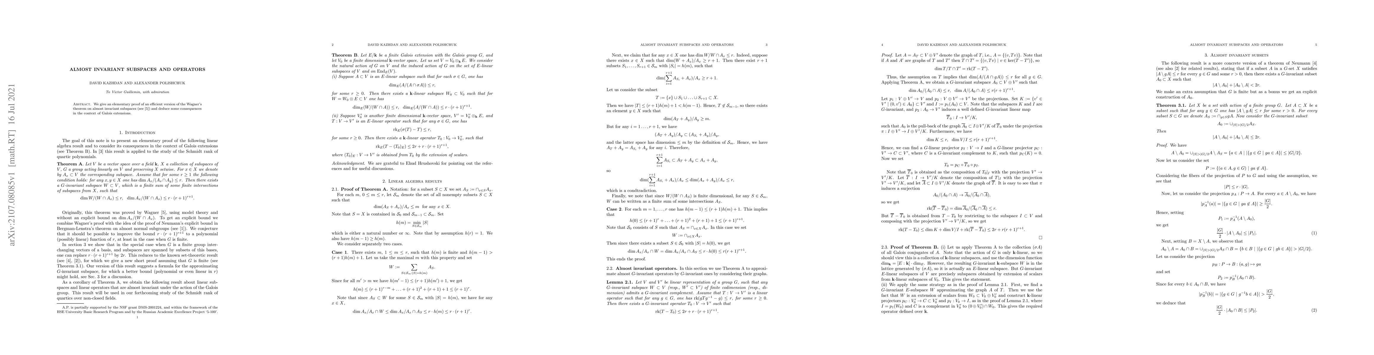 We give an elementary proof of an efficient version of the Wagner's theorem on almost invariant subspaces and deduce some consequences in the context of Galois extensions.