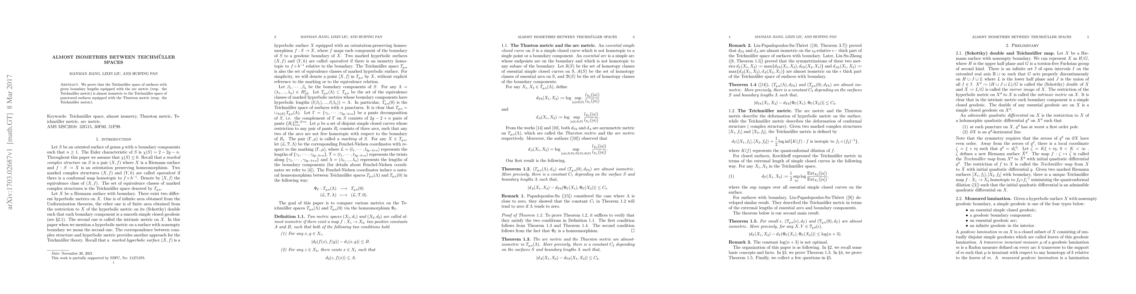 Summary: The paper proves that Teichmüller spaces of surfaces with fixed boundary lengths, using arc or Teichmüller metrics, are almost isometric to those of punctured surfaces using Thurston or Teichmüller metrics. This highlights a strong structural similarity between the two types of Teichmüller spaces.
