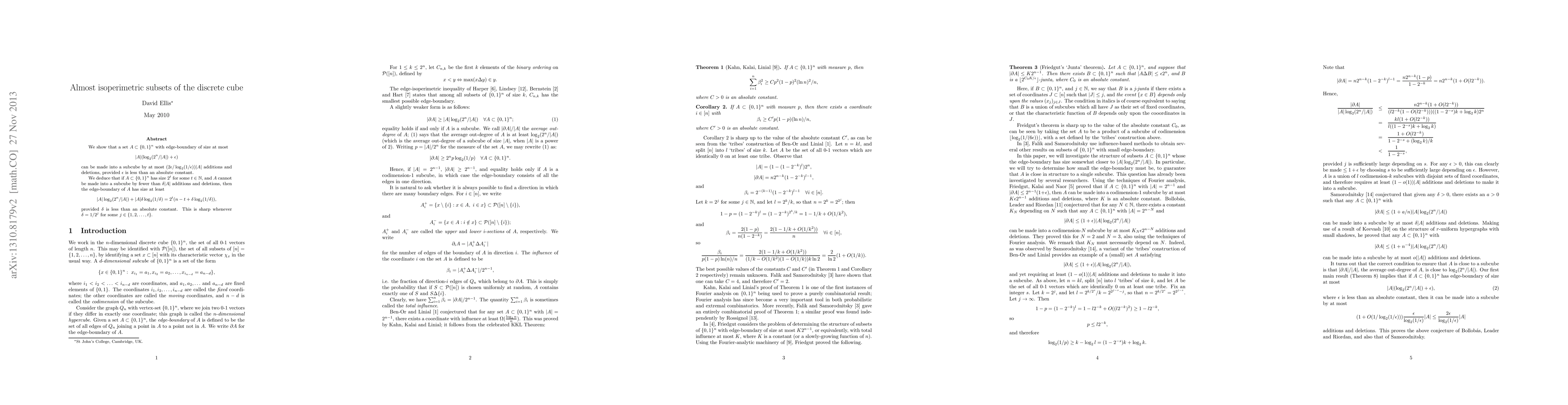 We show that a set $A \subset \{0,1\}^{n}$ with edge-boundary of size at most $|A| (\log_{2}(2^{n}/|A|) + \epsilon)$ can be made into a subcube by at most $(2 \epsilon/\log_{2}(1/\epsilon))|A|$ additions and deletions, provided $\epsilon$ is less than an absolute constant. We deduce that if $A \subset \{0,1\}^{n}$ has size $2^{t}$ for some $t \in \mathbb{N}$, and cannot be made into a subcube by fewer than $\delta |A|$ additions and deletions, then its edge-boundary has size at least $|A| \log_{2}(2^{n}/|A|) + |A| \delta \log_{2}(1/\delta) = 2^{t}(n-t+\delta \log_{2}(1/\delta))$, provided $\delta$ is less than an absolute constant. This is sharp whenever $\delta = 1/2^{j}$ for some $j \in \{1,2,\ldots,t\}$.