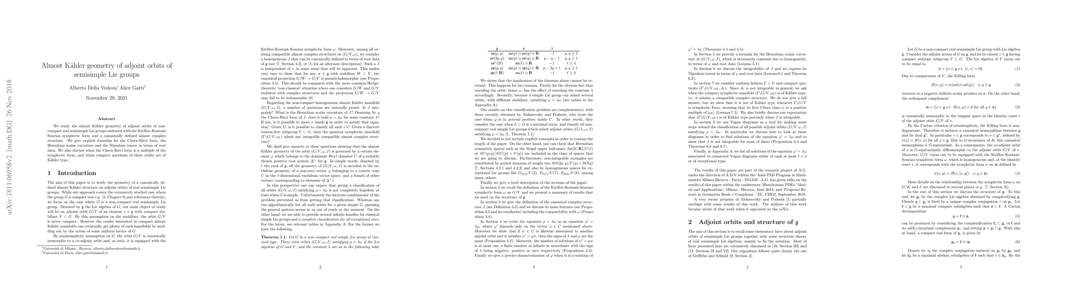 This paper explores the almost Kähler geometry of adjoint orbits in non-compact real semisimple Lie groups, focusing on the symplectic form and canonical complex structure. It provides explicit expressions for the Chern-Ricci form, Hermitian scalar curvature, and Nijenhuis tensor using root data, and investigates conditions under which the Chern-Ricci form is a multiple of the symplectic form and when compact quotients are of Kähler type.