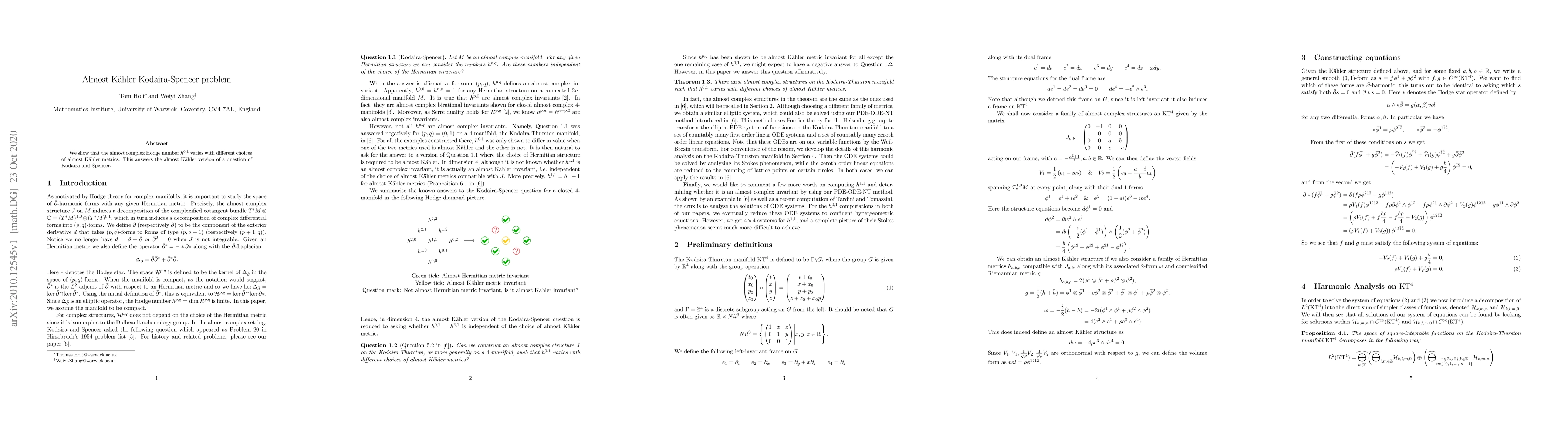 Summary: The paper demonstrates that the almost complex Hodge number $h^{0,1}$ varies under different almost Kähler metrics, resolving the almost Kähler variant of a question posed by Kodaira and Spencer.