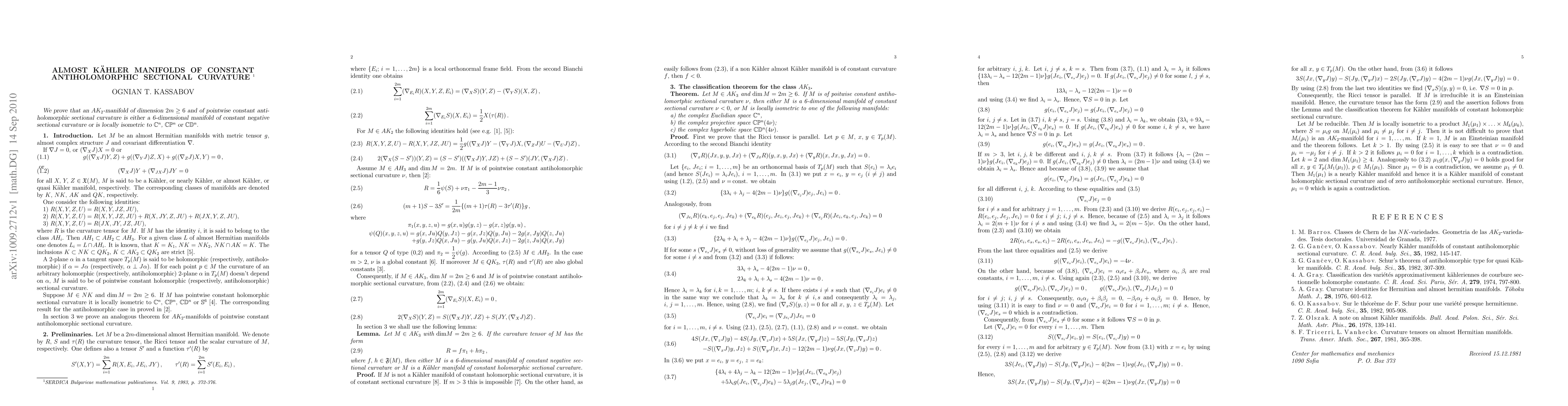 Summary: The paper proves that AK2-manifolds of dimension ≥6 with constant antiholomorphic sectional curvature are either 6-dimensional manifolds with constant negative sectional curvature or Kähler manifolds with constant holomorphic sectional curvature.