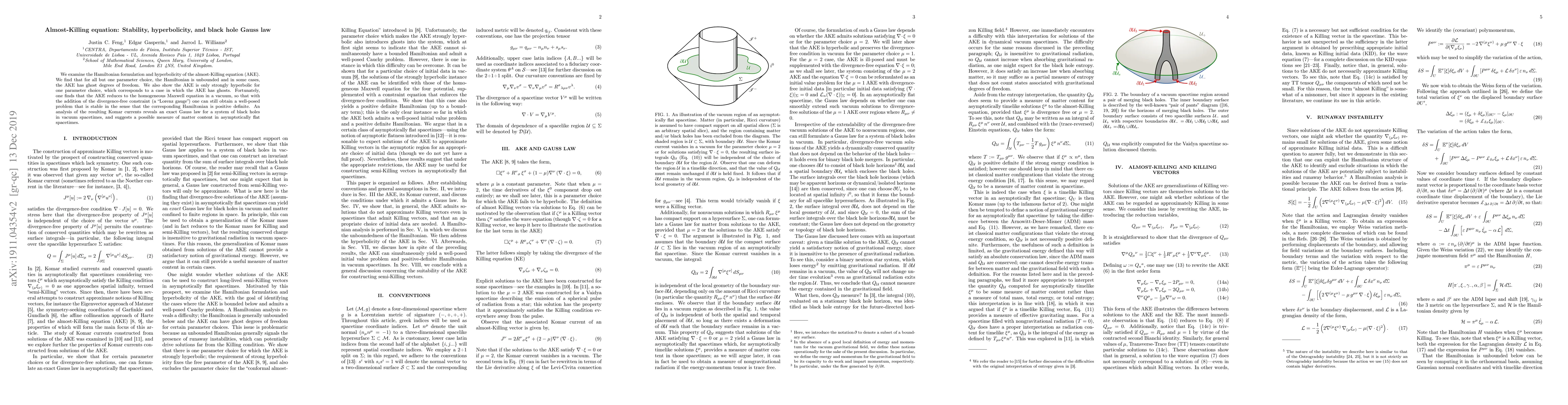 We examine the Hamiltonian formulation and hyperbolicity of the almost-Killing equation (AKE). We find that for all but one parameter choice, the Hamiltonian is unbounded, and in some cases, the AKE has ghost degrees of freedom. We also show the AKE is only strongly hyperbolic for one parameter choice, which corresponds to a case in which the AKE has ghosts. Fortunately, one finds that the AKE reduces to the homogeneous Maxwell equation in a vacuum, so that with the addition of the divergence-free constraint (a "Lorenz gauge"), one can still obtain a well-posed problem that is stable in the sense that the corresponding Hamiltonian is positive definite. An analysis of the resulting Komar currents reveals an exact Gauss law for a system of black holes in vacuum spacetimes and suggests a possible measure of matter content in asymptotically flat spacetimes.