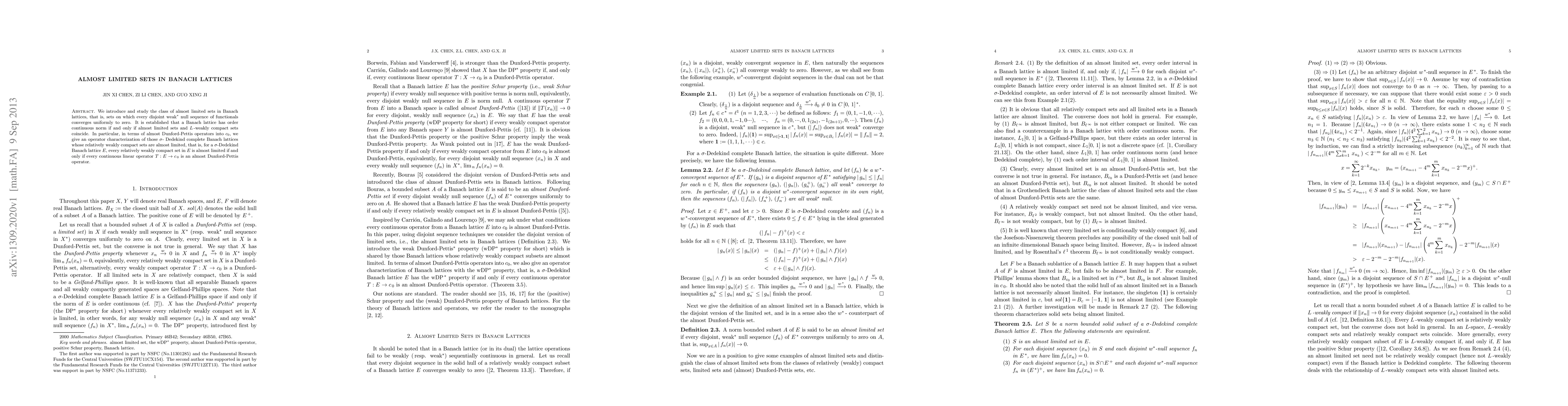 This paper introduces almost limited sets in Banach lattices, where every disjoint weak$^{*}$ null sequence of functionals converges uniformly to zero. It proves that a Banach lattice has an order continuous norm if and only if almost limited sets and $L$-weakly compact sets are equivalent. Additionally, it provides an operator characterization for $\sigma$-Dedekind complete Banach lattices where relatively weakly compact sets are almost limited.