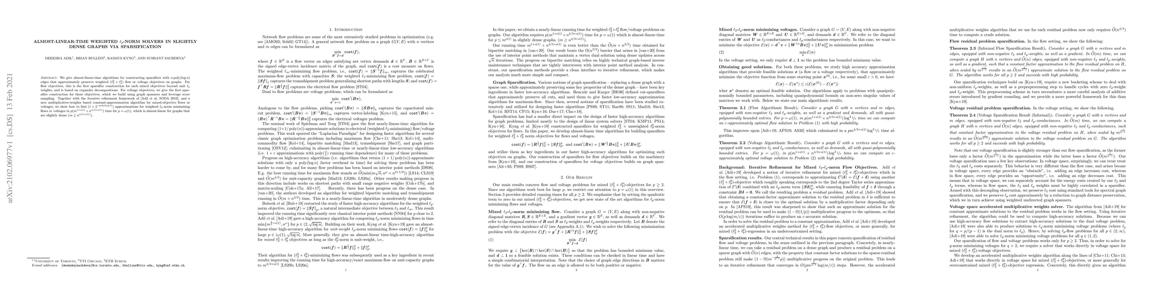 We give almost-linear-time algorithms for constructing sparsifiers with $n\ poly(\log n)$ edges that approximately preserve weighted $(\ell^{2}_2 + \ell^{p}_p)$ flow or voltage objectives on graphs. For flow objectives, this is the first sparsifier construction for such mixed objectives beyond unit $\ell_p$ weights, and is based on expander decompositions. For voltage objectives, we give the first sparsifier construction for these objectives, which we build using graph spanners and leverage score sampling. Together with the iterative refinement framework of [Adil et al, SODA 2019], and a new multiplicative-weights based constant-approximation algorithm for mixed-objective flows or voltages, we show how to find $(1+2^{-\text{poly}(\log n)})$ approximations for weighted $\ell_p$-norm minimizing flows or voltages in $p(m^{1+o(1)} + n^{4/3 + o(1)})$ time for $p=\omega(1),$ which is almost-linear for graphs that are slightly dense ($m \ge n^{4/3 + o(1)}$).