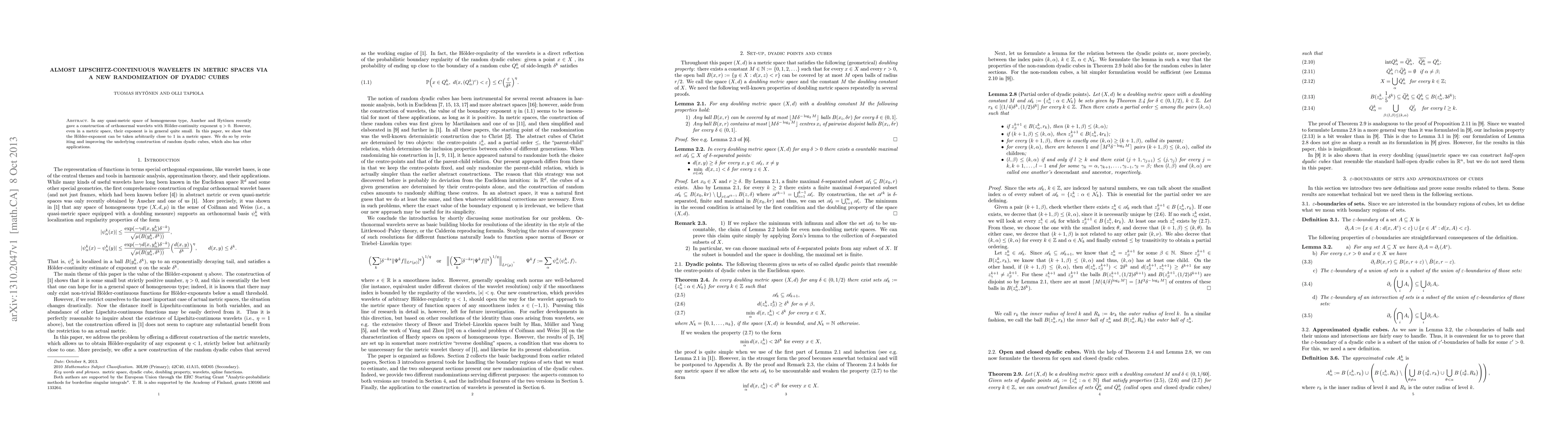 In any quasi-metric space of homogeneous type, Auscher and Hyt\"onen recently gave a construction of orthonormal wavelets with H\"older-continuity exponent $\eta>0$. However, even in a metric space, their exponent is in general quite small. In this paper, we show that the H\"older-exponent can be taken arbitrarily close to 1 in a metric space. We do so by revisiting and improving the underlying construction of random dyadic cubes, which also has other applications.
