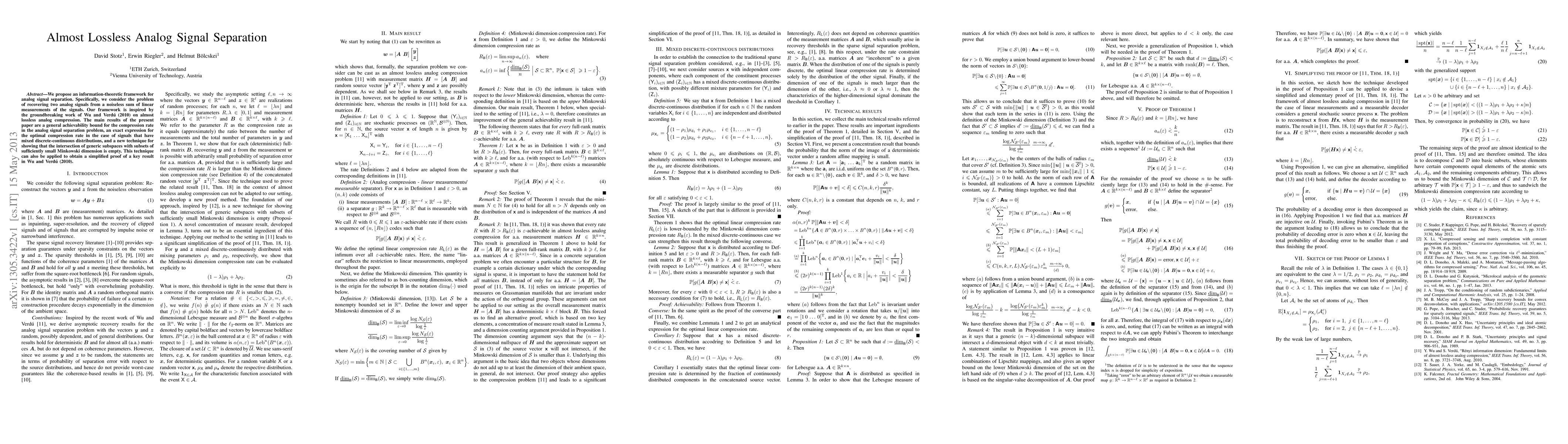 This paper introduces an information-theoretic framework for almost lossless analog signal separation, deriving a general achievability bound and an exact expression for optimal compression rates for mixed discrete-continuous signals. The authors also develop a new technique for proving the emptiness of intersections in generic subspaces.