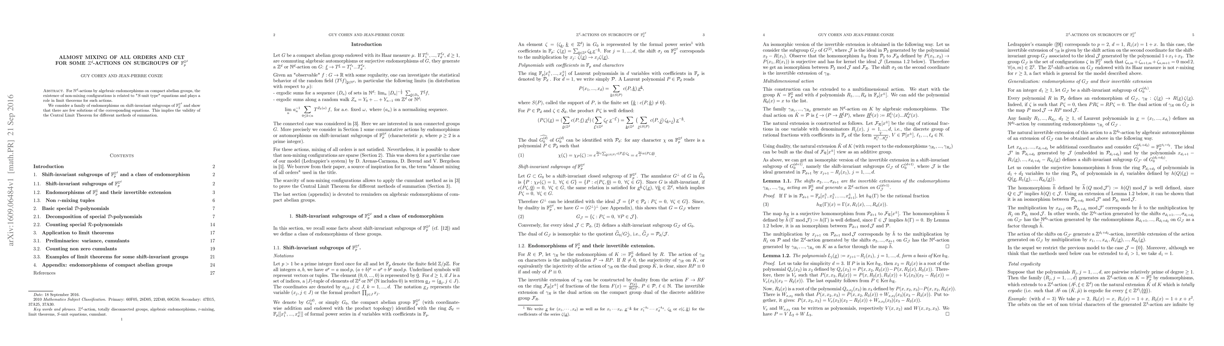 This research demonstrates that for specific $mathbb{Z}^d$-actions on subgroups of $mathbb{F}_p^{mathbb{Z}^d}$, there are limited 'S-unit type' equation solutions, leading to almost mixing of all orders. This further implies the applicability of the Central Limit Theorem for various summation methods in these actions.