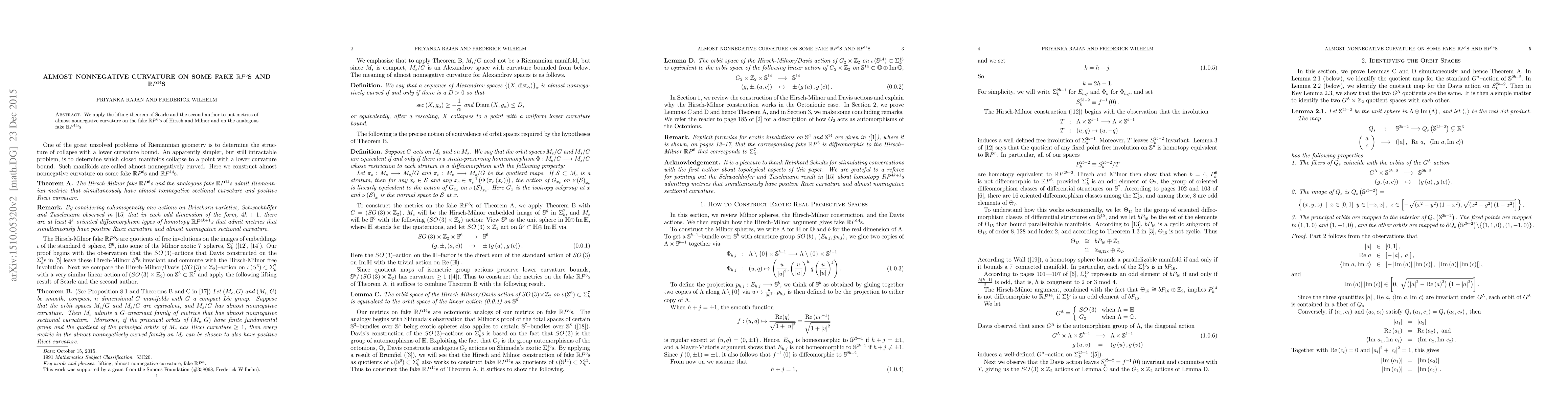 Summary: The paper utilizes the lifting theorem to introduce metrics with almost nonnegative curvature on fake real projective spaces RP^6 and RP^14, constructed by Hirsch and Milnor, respectively. This approach leverages previous work by Searle and the second author.