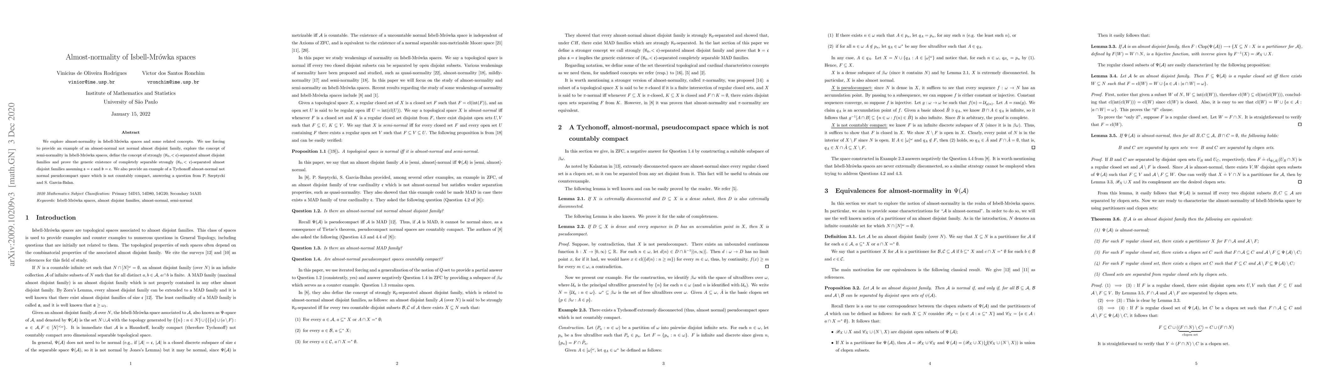 This paper investigates the almost-normality of Isbell-Mr\'owka spaces, introducing the concept of semi-normality and proving the generic existence of completely separable strongly $(\aleph_0, <\mathfrak c)$-almost disjoint families under certain cardinal assumptions. It also presents a Tychonoff almost-normal not normal pseudocompact space, addressing a question posed by P. Szeptycki and S. Garcia-Balan.
