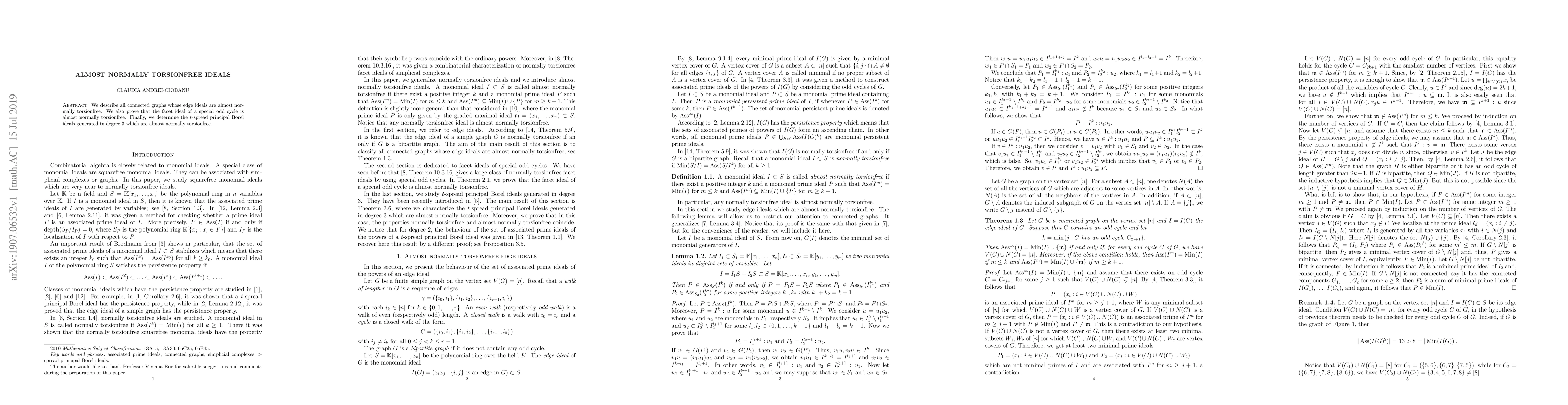 The work extends previous research by explicitly describing graphs with almost normally torsionfree edge ideals and proving properties for facet ideals of special odd cycles, contributing new insights to the theory of commutative algebra and combinatorics.