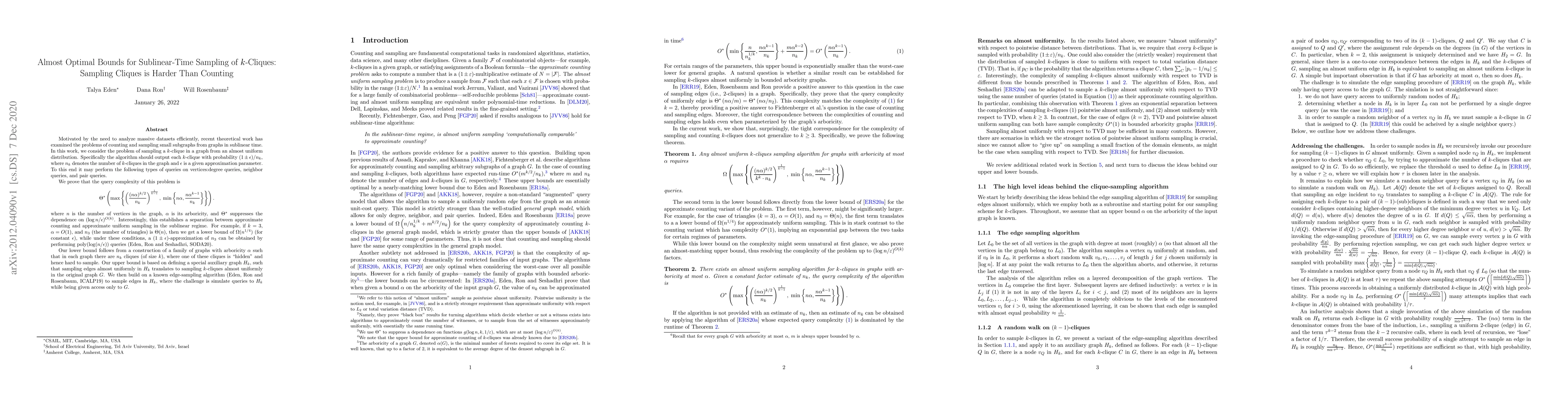 This paper explores the sublinear-time sampling of $k$-cliques in graphs, proving that the query complexity is $\Theta^*\left(\max\left\{ \left(\frac{(n\alpha)^{k/2}/n_k}\right)^{\frac{1}{k-1}} ,\; \min\left\{n\alpha,\frac{n\alpha^{k-1}}{n_k}\right\}\right\}\right)$. It establishes a separation between sampling and counting cliques, showing that sampling is more complex than counting in the sublinear regime.