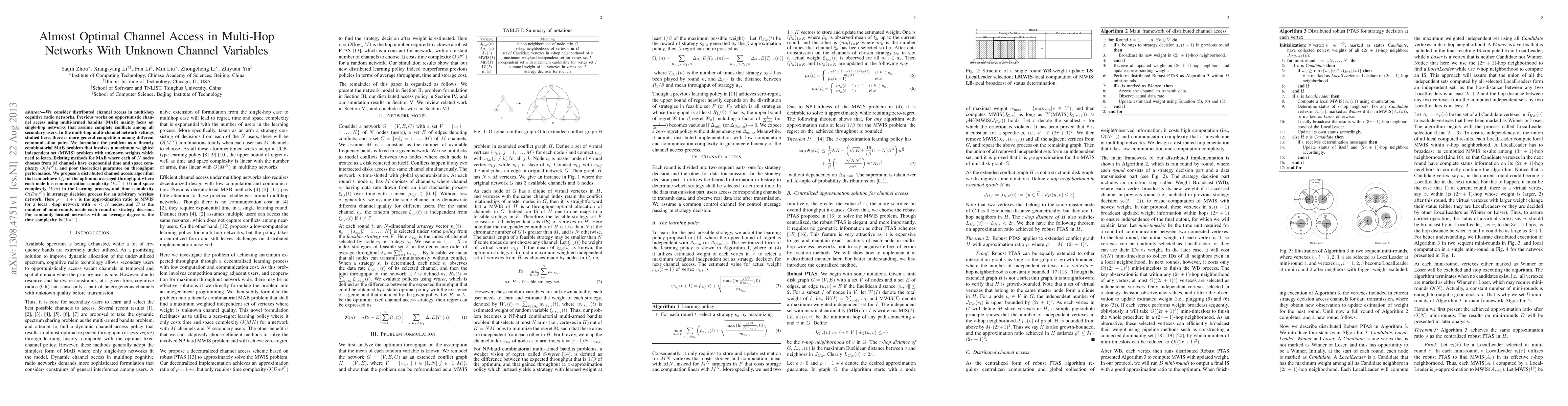 This paper proposes a distributed channel access algorithm for multi-hop cognitive radio networks, addressing the challenge of unknown channel variables. It achieves near-optimal throughput with reduced communication and space complexity compared to existing methods.