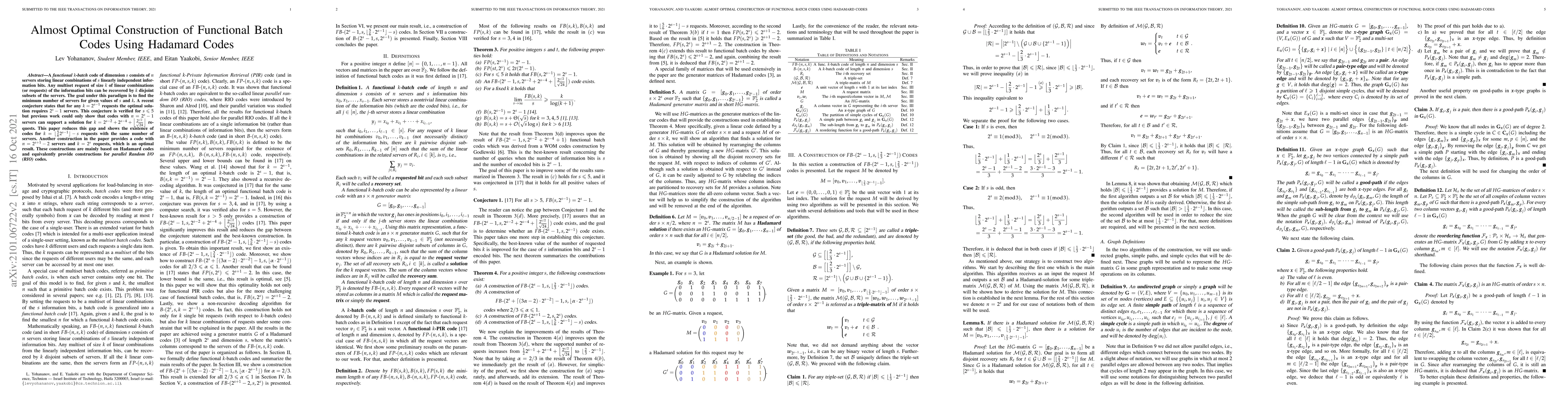 A \textit{functional $k$-batch} code of dimension $s$ consists of $n$ servers storing linear combinations of $s$ linearly independent information bits. Any multiset request of size $k$ of linear combinations (or requests) of the information bits can be recovered by $k$ disjoint subsets of the servers. The goal under this paradigm is to find the minimum number of servers for given values of $s$ and $k$. A recent conjecture states that for any $k=2^{s-1}$ requests the optimal solution requires $2^s-1$ servers. This conjecture is verified for $s\leq 5$ but previous work could only show that codes with $n=2^s-1$ servers can support a solution for $k=2^{s-2} + 2^{s-4} + \left\lfloor \frac{ 2^{s/2}}{\sqrt{24}} \right\rfloor$ requests. This paper reduces this gap and shows the existence of codes for $k=\lfloor \frac{5}{6}2^{s-1} \rfloor - s$ requests with the same number of servers. Another construction in the paper provides a code with $n=2^{s+1}-2$ servers and $k=2^{s}$ requests, which is an optimal result.These constructions are mainly based on Hadamard codes and equivalently provide constructions for \textit{parallel Random I/O (RIO)} codes.