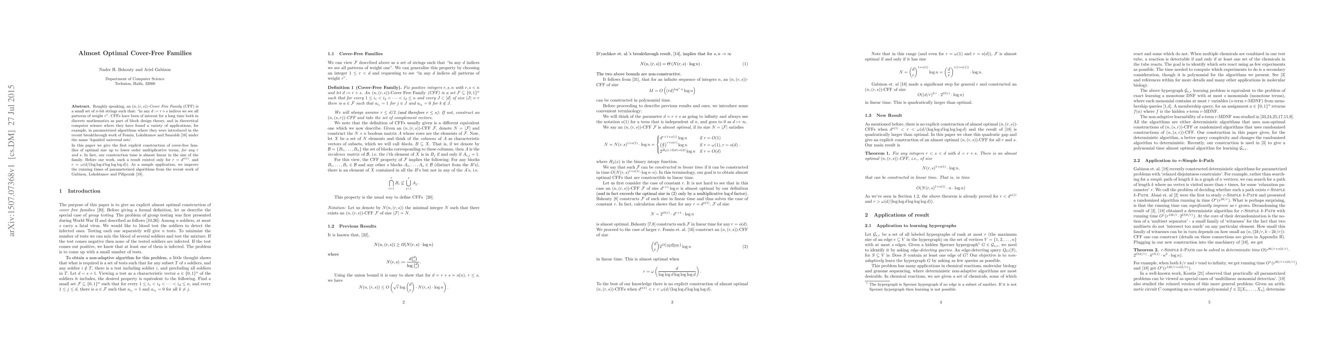 Roughly speaking, an $(n,(r,s))$-Cover Free Family (CFF) is a small set of $n$-bit strings such that: "in any $d:=r+s$ indices we see all patterns of weight $r$". CFFs have been of interest for a long time both in discrete mathematics as part of block design theory, and in theoretical computer science where they have found a variety of applications, for example, in parametrized algorithms where they were introduced in the recent breakthrough work of Fomin, Lokshtanov and Saurabh under the name `lopsided universal sets'. In this paper we give the first explicit construction of cover-free families of optimal size up to lower order multiplicative terms, {for any $r$ and $s$}. In fact, our construction time is almost linear in the size of the family. Before our work, such a result existed only for $r=d^{o(1)}$. and $r= \omega(d/(\log\log d\log\log\log d))$. As a sample application, we improve the running times of parameterized algorithms from the recent work of Gabizon, Lokshtanov and Pilipczuk.