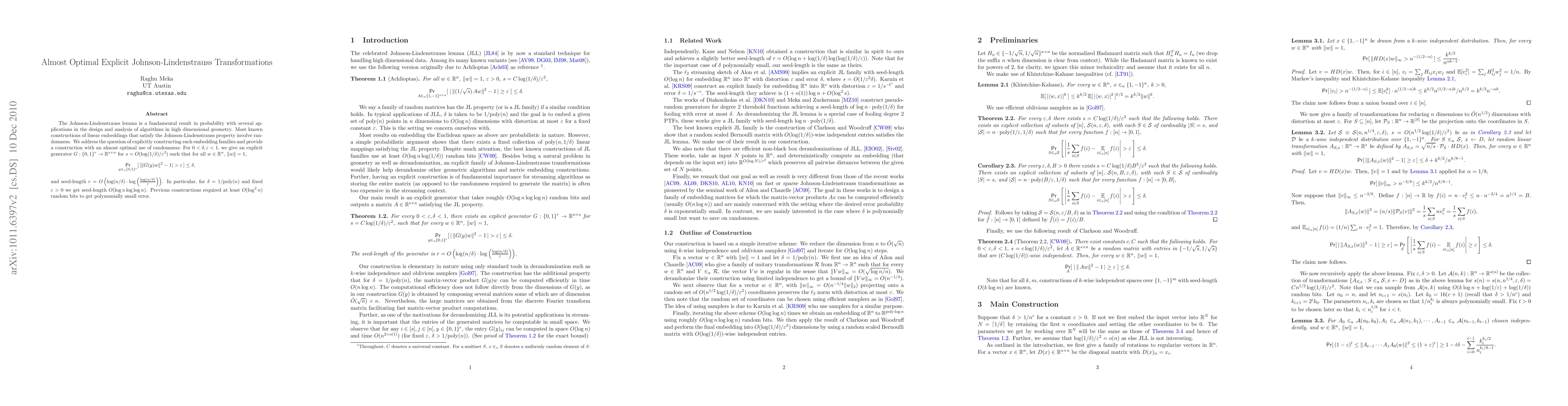 This paper presents an almost optimal explicit construction for Johnson-Lindenstrauss transformations, using significantly fewer random bits than previous methods. The new method requires O(log(n/delta)log(log(n/delta)/epsilon)) random bits for embedding n dimensions to O(log(1/delta)/epsilon^2) dimensions with error probability delta and distortion epsilon.