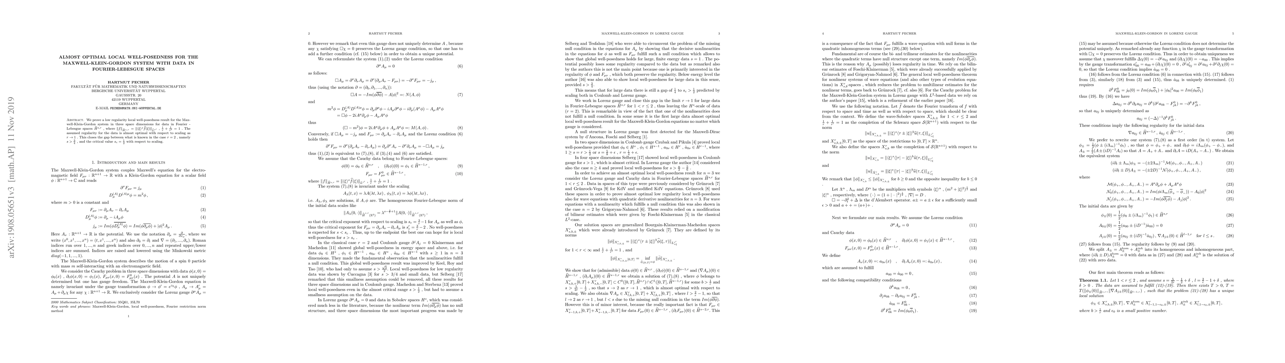 We prove a low regularity local well-posedness result for the Maxwell-Klein-Gordon system in three space dimensions for data in Fourier - Lebesgue spaces $\widehat{H}^{s,r}$ , where $\|f\|_{\widehat{H}^{s,r}} = \|\langle \xi \rangle^s \widehat{f}(\xi)\|_{\widehat{L}^{r'}}$ , $\frac{1}{r}+\frac{1}{r'} = 1$ . The assumed regularity for the data is almost optimal with respect to scaling as $r \to 1$ . This closes the gap between what is known in the case $r=2$ , namely $s > \frac{3}{4}$ , and the critical value $s_c = \frac{1}{2}$ with respect to scaling.