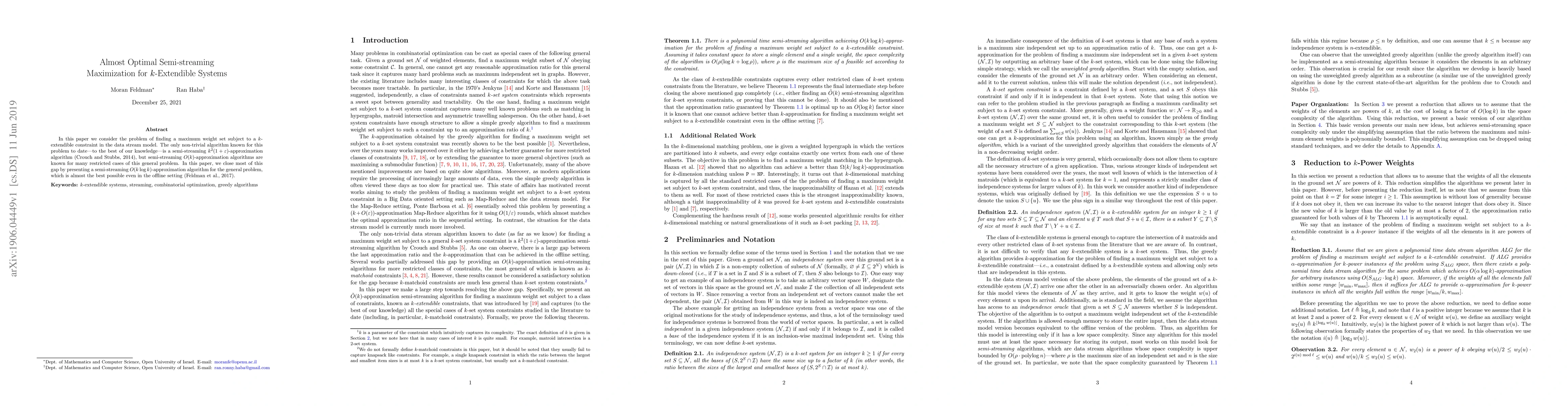 A semi-streaming $O(k imes log k)$-approximation algorithm is presented for a maximum weight set problem with a $k$-extendible constraint, closing most of the gap in previous known algorithms.