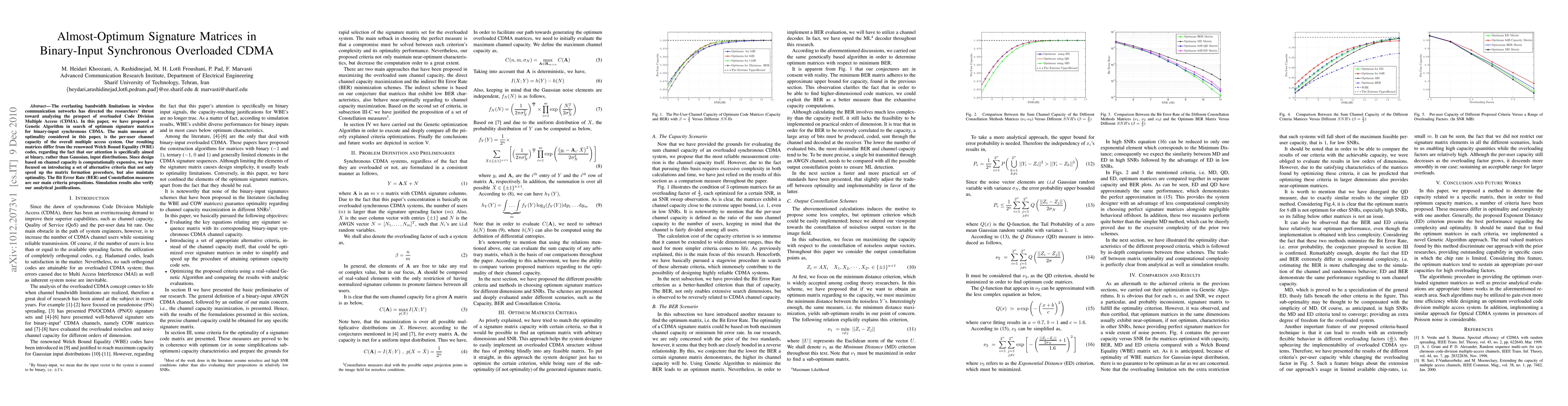 The paper presents a novel Genetic Algorithm-based approach for designing optimum signature matrices in binary-input synchronous CDMA, along with alternative criteria (BER, Constellation measures) to address computational complexity issues.