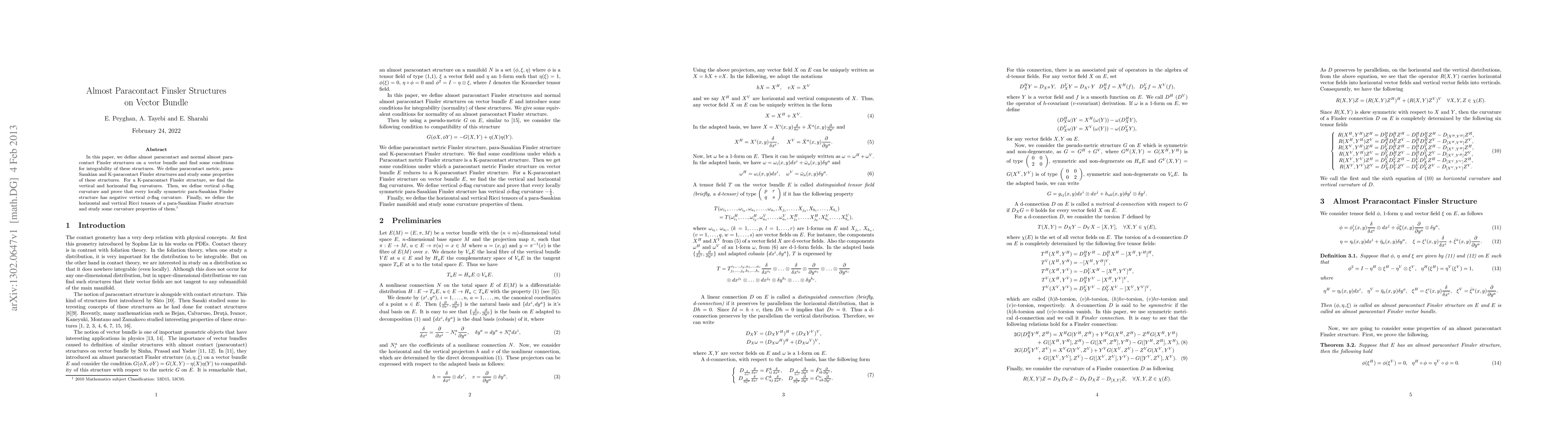 In this paper, we define almost paracontact and normal almost paracontact Finsler structures on a vector bundle and find some conditions for integrability of these structures. We define paracontact metric, para- Sasakian and K-paracontact Finsler structures and study some properties of these structures. For a K-paracontact Finsler structure, we find the vertical and horizontal flag curvatures. Then, we define vertical ?-flag curvature and prove that every locally symmetric para-Sasakian Finsler structure has negative vertical ?-flag curvature. Finally, we define the horizontal and vertical Ricci tensors of a para-Sasakian Finsler structure and study some curvature properties of them.