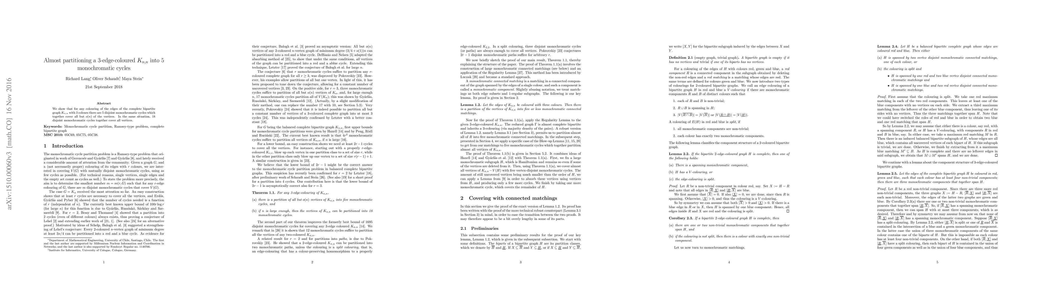 This paper demonstrates that any 3-edge-colouring of the complete bipartite graph $K_{n,n}$ allows for the formation of 5 disjoint monochromatic cycles covering all but $o(n)$ vertices, while 18 such cycles can cover all vertices.
