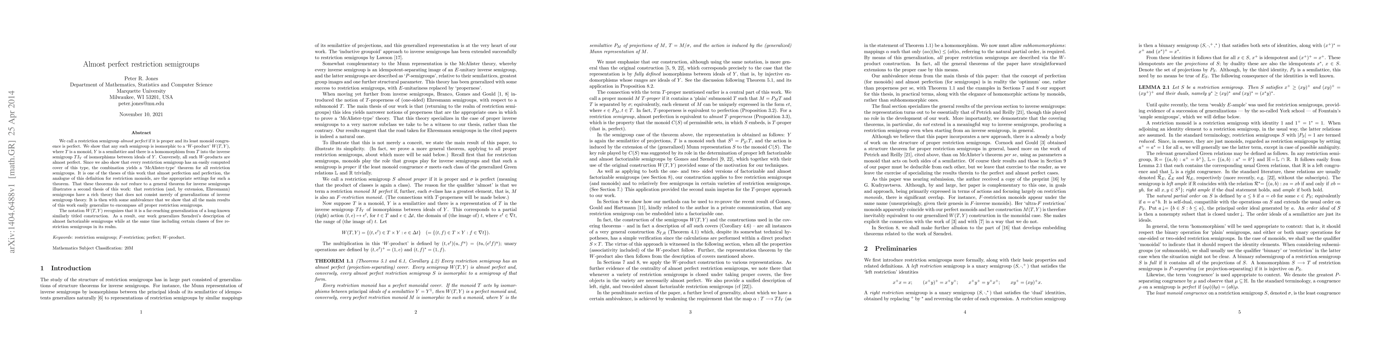 We call a restriction semigroup almost perfect if it is proper and its least monoid congruence is perfect. We show that any such semigroup is isomorphic to a `$W$-product' $W(T,Y)$, where $T$ is a monoid, $Y$ is a semilattice and there is a homomorphism from $T$ into the inverse semigroup $TI_Y$ of isomorphisms between ideals of $Y$. Conversely, all such $W$-products are almost perfect. Since we also show that every restriction semigroup has an easily computed cover of this type, the combination yields a `McAlister-type' theorem for all restriction semigroups. It is one of the theses of this work that almost perfection and perfection, the analogue of this definition for restriction monoids, are the appropriate settings for such a theorem. That these theorems do not reduce to a general theorem for inverse semigroups illustrates a second thesis of this work: that restriction (and, by extension, Ehresmann) semigroups have a rich theory that does not consist merely of generalizations of inverse semigroup theory. It is then with some ambivalence that we show that all the main results of this work easily generalize to encompass all proper restriction semigroups. The notation $W(T,Y)$ recognizes that it is a far-reaching generalization of a long-known similarly titled construction. As a result, our work generalizes Szendrei's description of almost factorizable semigroups while at the same time including certain classes of free restriction semigroups in its realm.