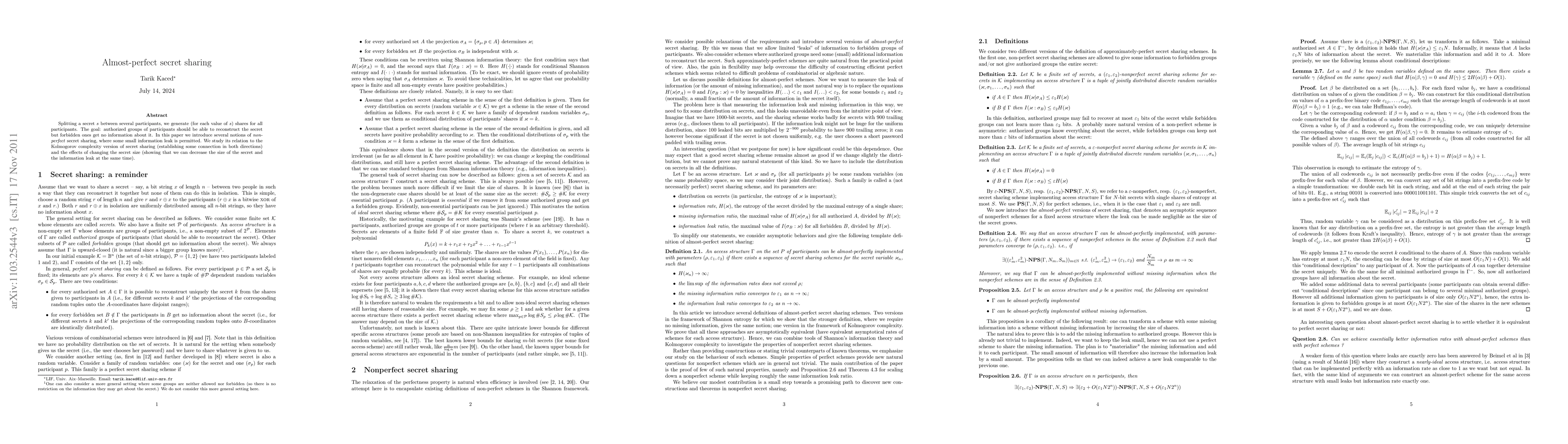 Researchers explored non-perfect secret sharing schemes that allow small information leaks while maintaining authorized group reconstruction of a secret. They found connections to Kolmogorov complexity and showed how reducing secret size can decrease information leak.