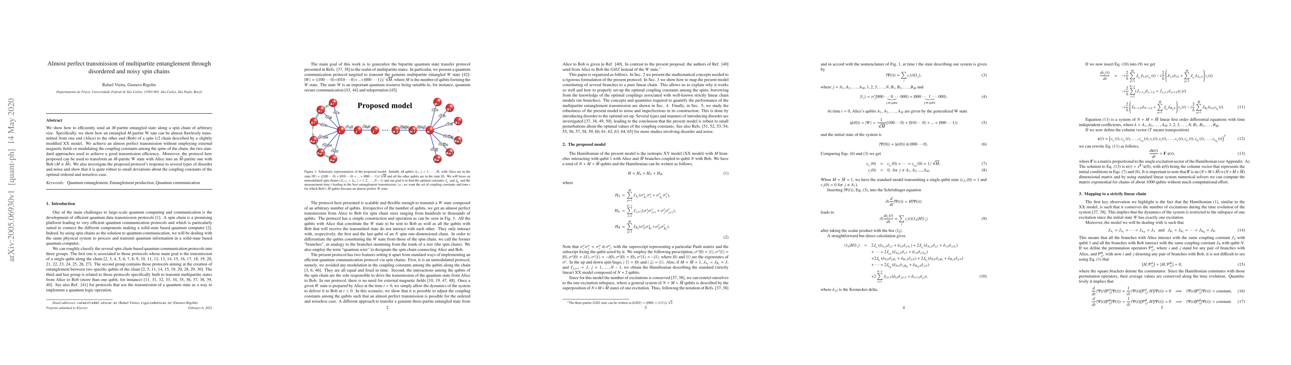 We show how to efficiently send an M-partite entangled state along a spin chain of arbitrary size. Specifically, we show how an entangled M-partite W sate can be almost flawlessly transmitted from one end (Alice) to the other end (Bob) of a spin-1/2 chain described by a slightly modified XX model. We achieve an almost perfect transmission without employing external magnetic fields or modulating the coupling constants among the spins of the chain, the two standard approaches used to achieve a good transmission efficiency. Moreover, the protocol here proposed can be used to transform an M-partite W state with Alice into an M'-partite one with Bob (M different from M'). We also investigate the proposed protocol's response to several types of disorder and noise and show that it is quite robust to small deviations about the coupling constants of the optimal ordered and noiseless case.