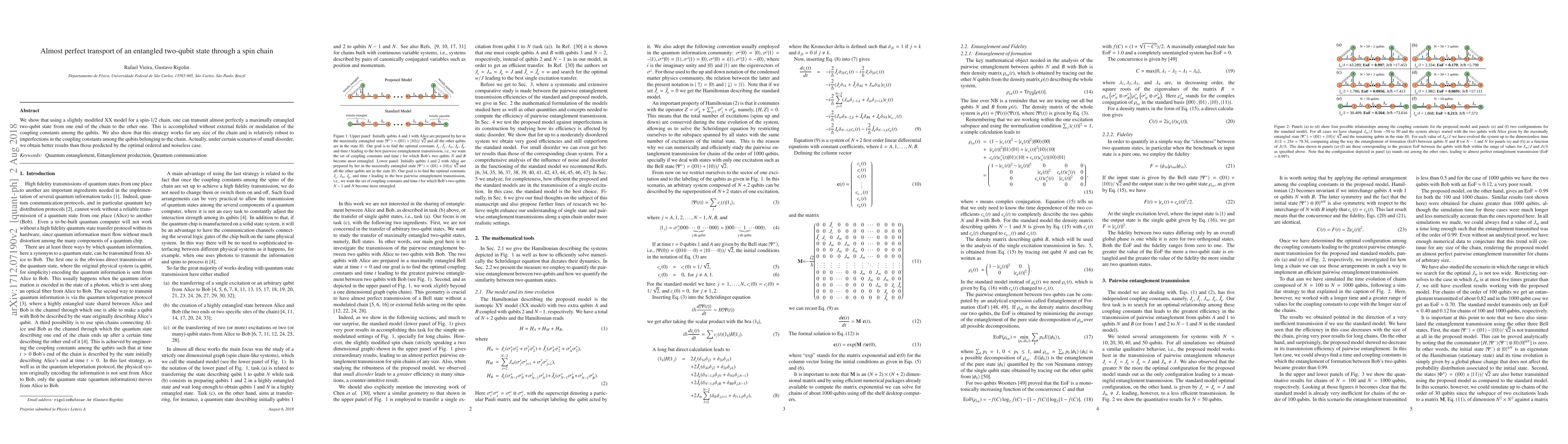 We show that using a slightly modified XX model for a spin-1/2 chain, one can transmit almost perfectly a maximally entangled two-qubit state from one end of the chain to the other one. This is accomplished without external fields or modulation of the coupling constants among the qubits. We also show that this strategy works for any size of the chain and is relatively robust to imperfections in the coupling constants among the qubits belonging to the chain. Actually, under certain scenarios of small disorder, we obtain better results than those predicted by the optimal ordered and noiseless case.