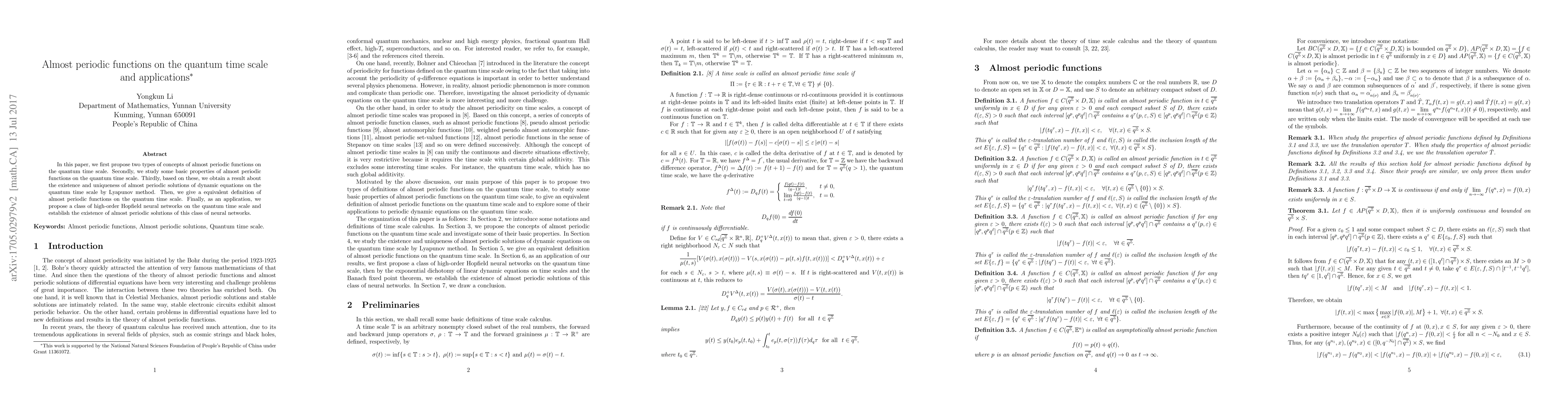 This paper introduces two types of almost periodic functions on the quantum time scale, explores their properties, and uses the Lyapunov method to establish the existence and uniqueness of almost periodic solutions for dynamic equations. It also proposes high-order Hopfield neural networks on the quantum time scale and proves the existence of their almost periodic solutions.
