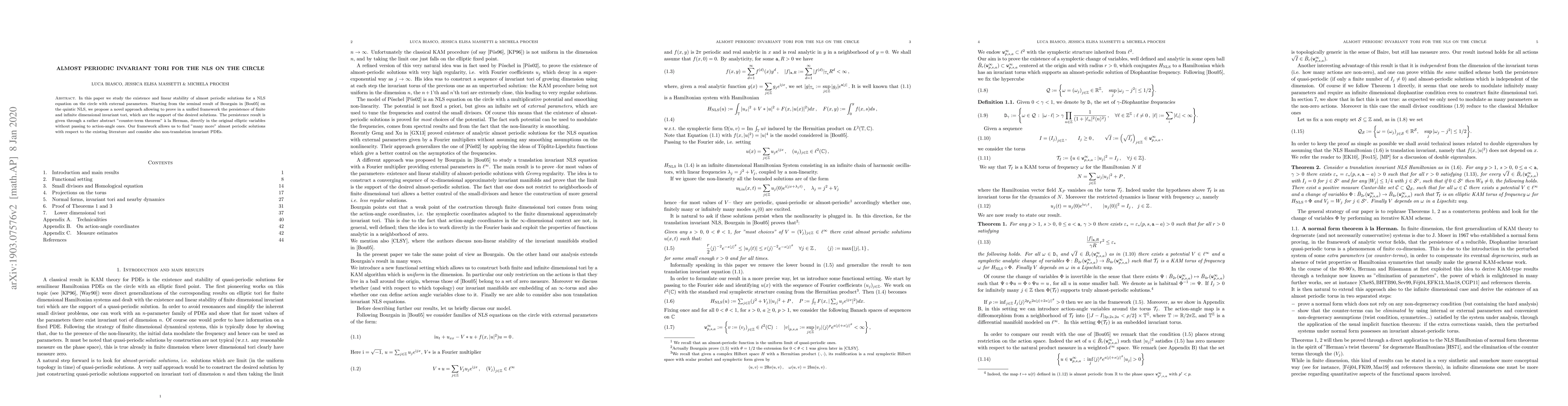 This paper explores the existence and linear stability of almost periodic solutions for a NLS equation on the circle, extending Bourgain's results. It proposes a novel approach to prove the persistence of invariant tori using a "counter-term theorem," finding more solutions than previous literature and accommodating non-translation invariant PDEs.