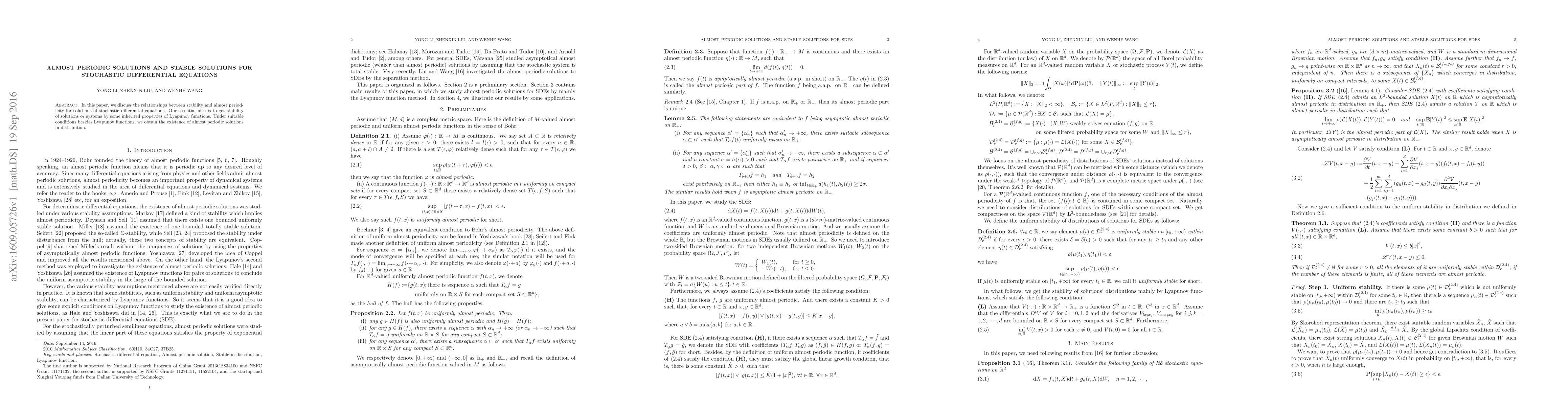 The paper analyzes stochastic differential equations (SDEs) using Lyapunov functions to establish relationships between stability and almost periodicity of solutions.