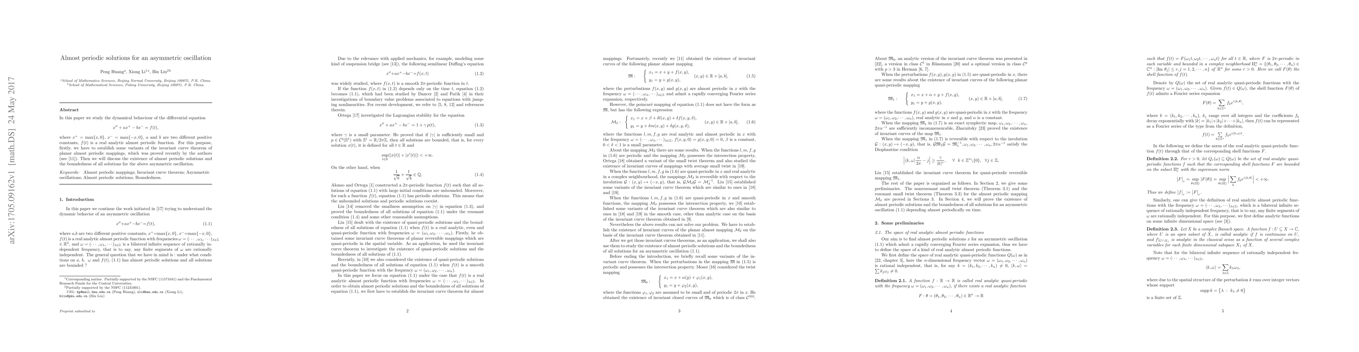In this paper we study the dynamical behaviour of the differential equation \begin{equation*} x''+ax^+ -bx^-=f(t), \end{equation*} where $x^+=\max\{x,0\}$,\ $x^-=\max\{-x,0\}$, $a$ and $b$ are two different positive constants, $f(t)$ is a real analytic almost periodic function. For this purpose, firstly, we have to establish some variants of the invariant curve theorem of planar almost periodic mappings, which was proved recently by the authors (see \cite{Huang}).\ Then we will discuss the existence of almost periodic solutions and the boundedness of all solutions for the above asymmetric oscillation.