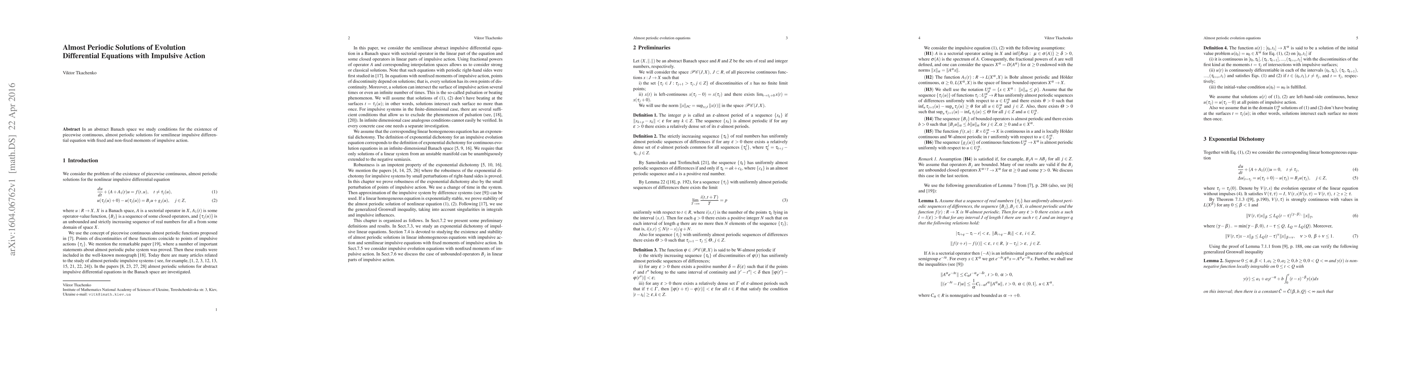 Summary: The paper investigates the conditions for the existence of almost periodic, piecewise continuous solutions in an abstract Banach space for semi-linear impulsive differential equations, considering both fixed and non-fixed moments of impulsive action.