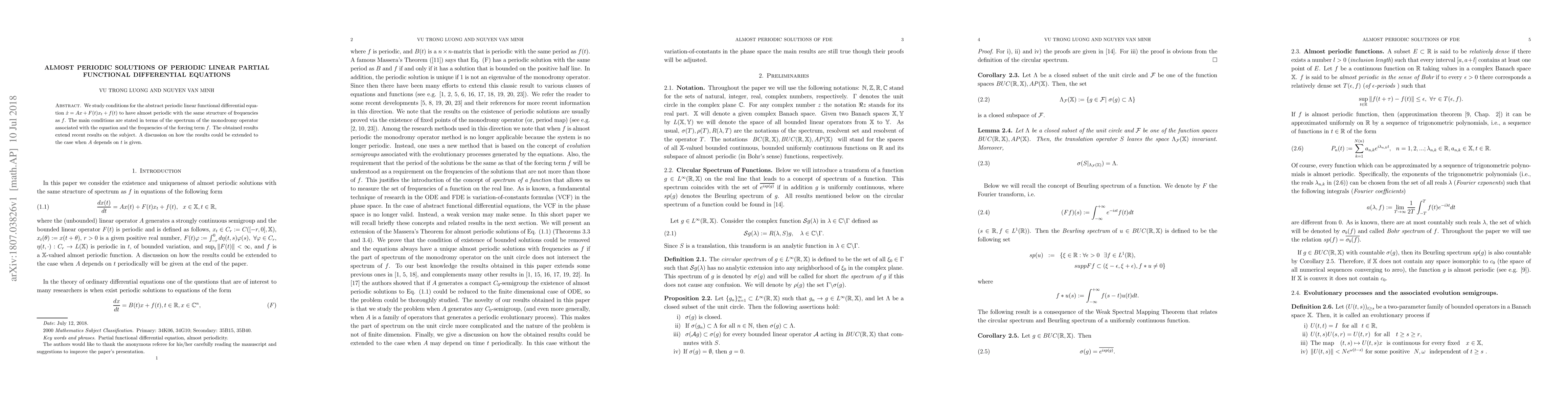 This paper investigates conditions for the existence of almost periodic solutions in periodic linear functional differential equations, focusing on the spectrum of the monodromy operator and the frequencies of the forcing term. The results extend previous findings and discuss potential extensions to time-dependent cases.