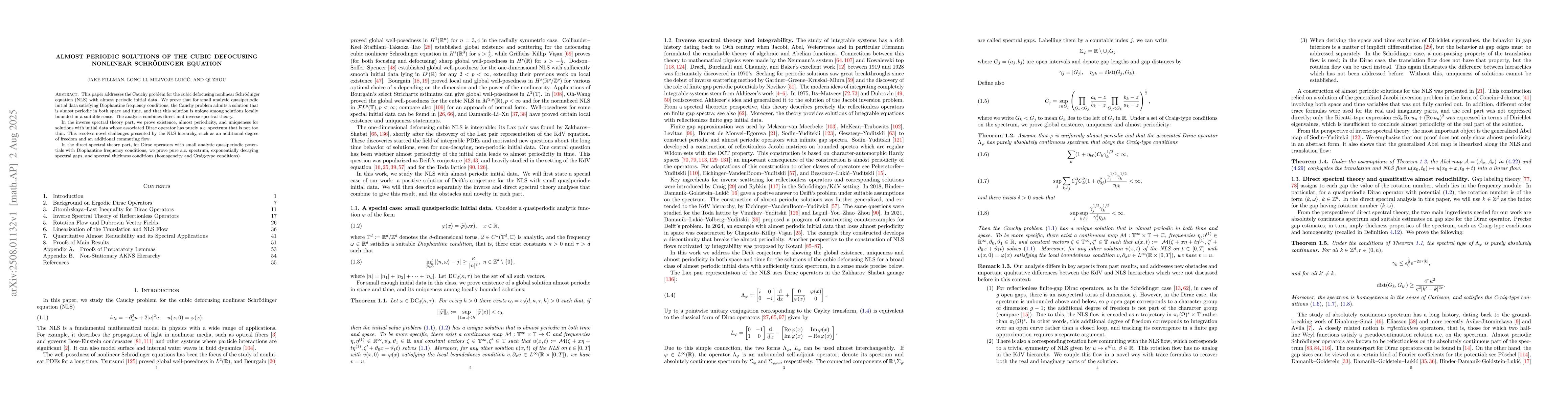 This paper addresses the Cauchy problem for the cubic defocusing nonlinear Schr\"odinger equation (NLS) with almost periodic initial data. We prove that for small analytic quasiperiodic initial data satisfying Diophantine frequency conditions, the Cauchy problem admits a solution that is almost periodic in both space and time, and that this solution is unique among solutions locally bounded in a suitable sense. The analysis combines direct and inverse spectral theory. In the inverse spectral theory part, we prove existence, almost periodicity, and uniqueness for solutions with initial data whose associated Dirac operator has purely a.c.\ spectrum that is not too thin. This resolves novel challenges presented by the NLS hierarchy, such as an additional degree of freedom and an additional commuting flow. In the direct spectral theory part, for Dirac operators with small analytic quasiperiodic potentials with Diophantine frequency conditions, we prove pure a.c.\ spectrum, exponentially decaying spectral gaps, and spectral thickness conditions (homogeneity and Craig-type conditions).