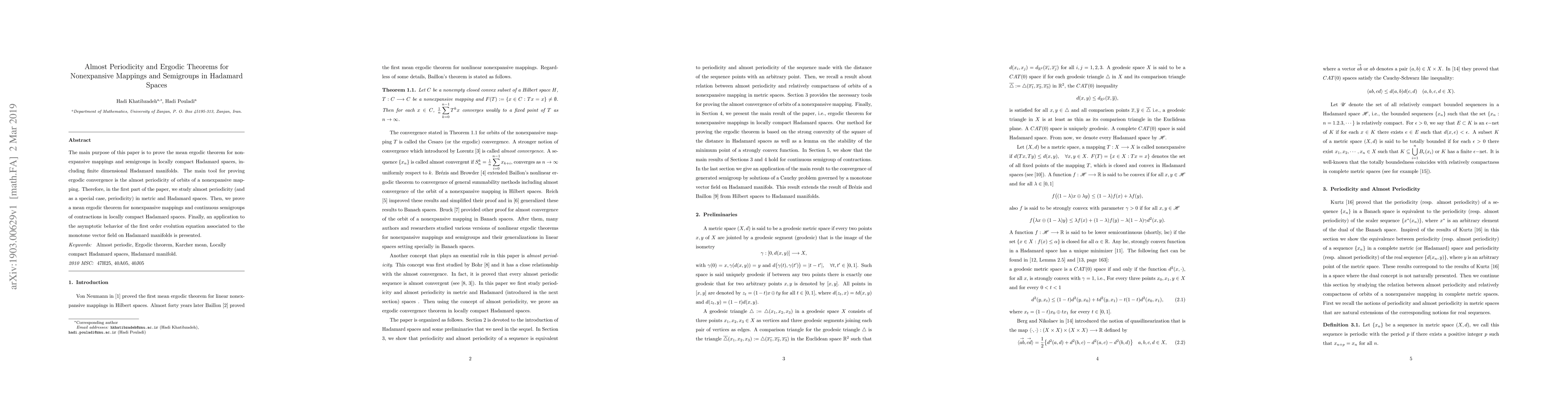 The main purpose of this paper is to prove the mean ergodic theorem for nonexpansive mappings and semigroups in locally compact Hadamard spaces, including finite dimensional Hadamard manifolds. The main tool for proving ergodic convergence is the almost periodicity of orbits of a nonexpansive mapping. Therefore, in the first part of the paper, we study almost periodicity (and as a special case, periodicity) in metric and Hadamard spaces. Then, we prove a mean ergodic theorem for nonexpansive mappings and continuous semigroups of contractions in locally compact Hadamard spaces. Finally, an application to the asymptotic behavior of the first order evolution equation associated to the monotone vector field on Hadamard manifolds is presented.
