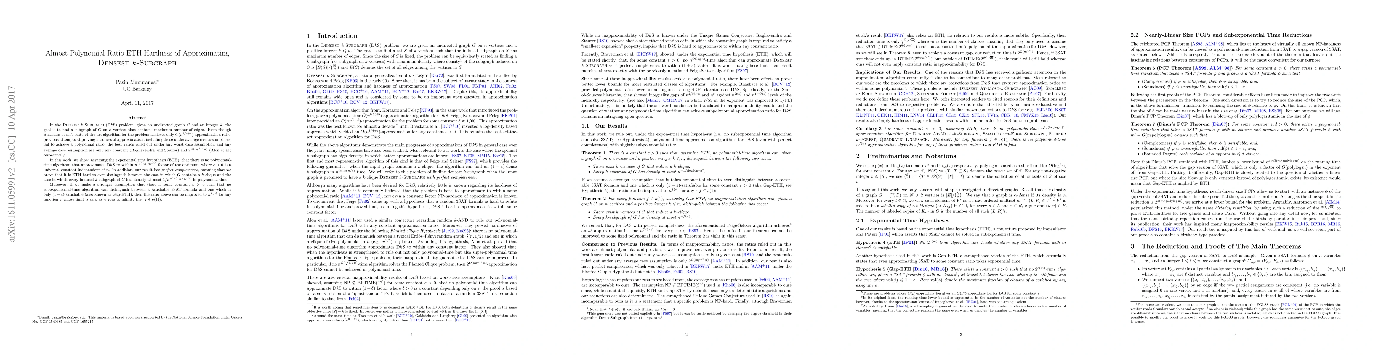 This paper proves ETH-hardness for approximating the Densest $k$-Subgraph problem, showing no polynomial-time algorithm can achieve a $n^{1/(\log \log n)^c}$ approximation ratio, where $c > 0$ is a universal constant. It also establishes perfect completeness under ETH, distinguishing $k$-cliques from sparse subgraphs. Under Gap-ETH, the approximation ratio improves to $n^{f(n)}$ with $f \in o(1)$.