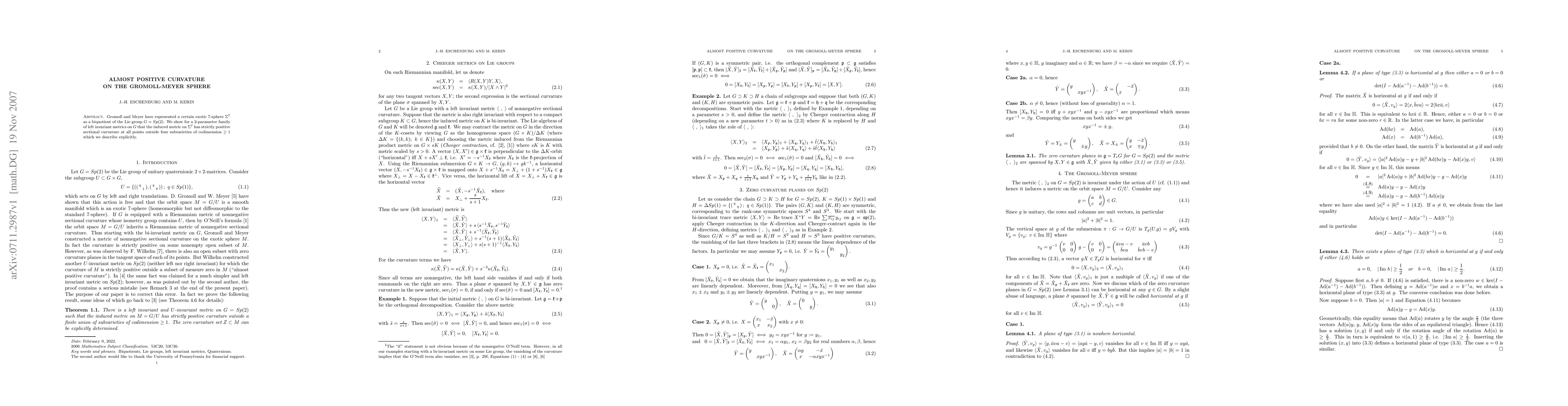 This paper demonstrates that the Gromoll-Meyer exotic 7-sphere $\Sigma^7$ exhibits almost positive curvature, with strictly positive sectional curvature everywhere except on four specified subvarieties of codimension at least 1. The curvature is derived from a 2-parameter family of left invariant metrics on the Lie group $G = Sp(2)$.