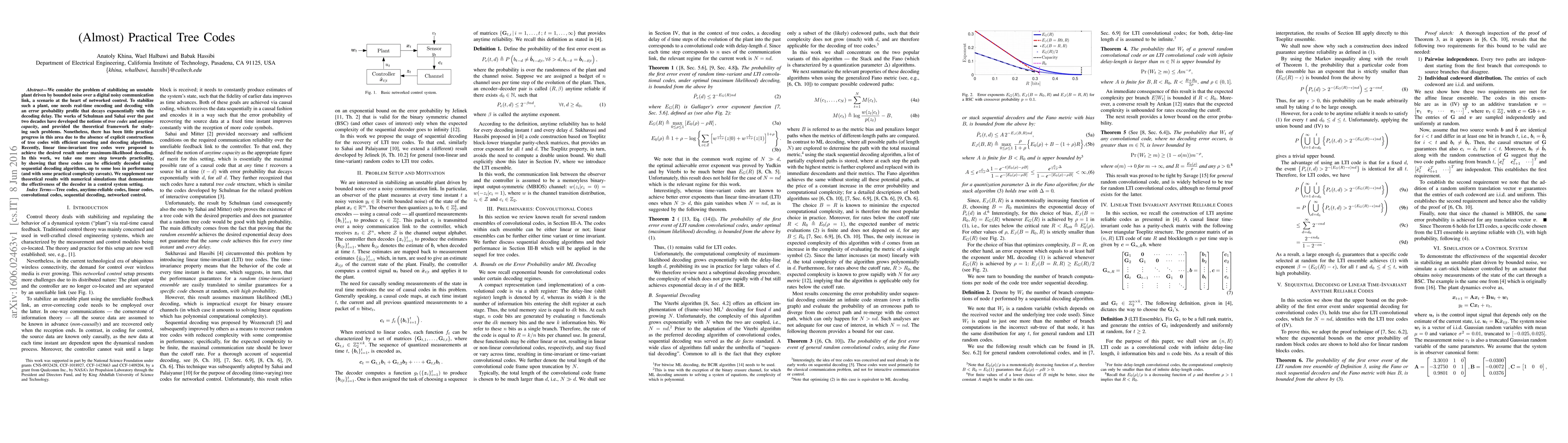 This paper proposes practical tree codes for stabilizing unstable plants driven by bounded noise over noisy communication links, achieving efficient sequential decoding with minor performance loss. Numerical simulations validate the decoder's effectiveness in networked control scenarios.