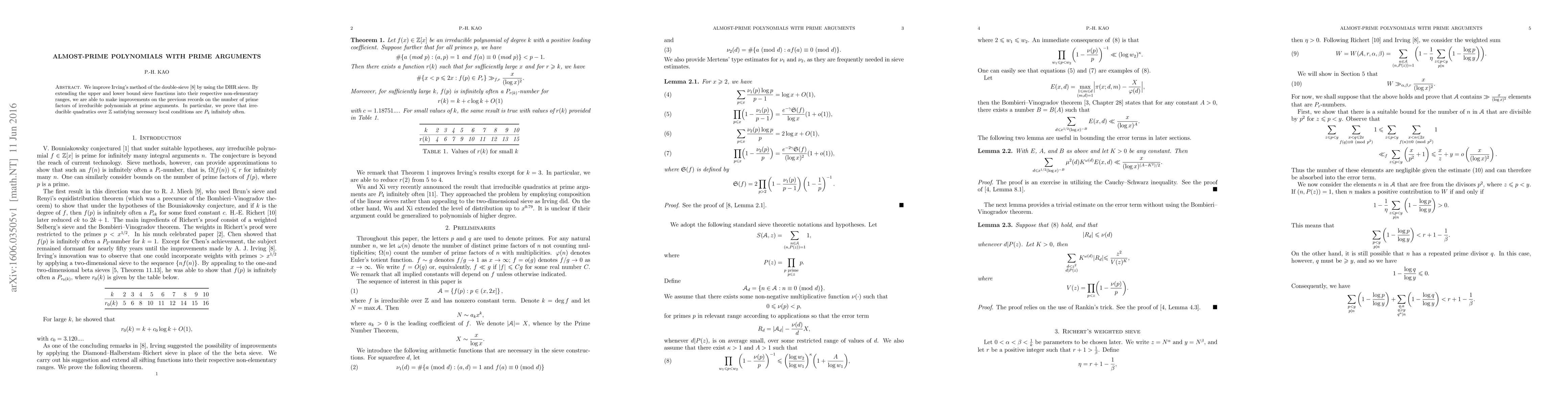 This paper enhances Irving's double-sieve method using the DHR sieve to improve records on the number of prime factors of irreducible polynomials evaluated at prime arguments. It proves that certain irreducible quadratic polynomials over $\mathbb{Z}$ have four prime factors infinitely often.
