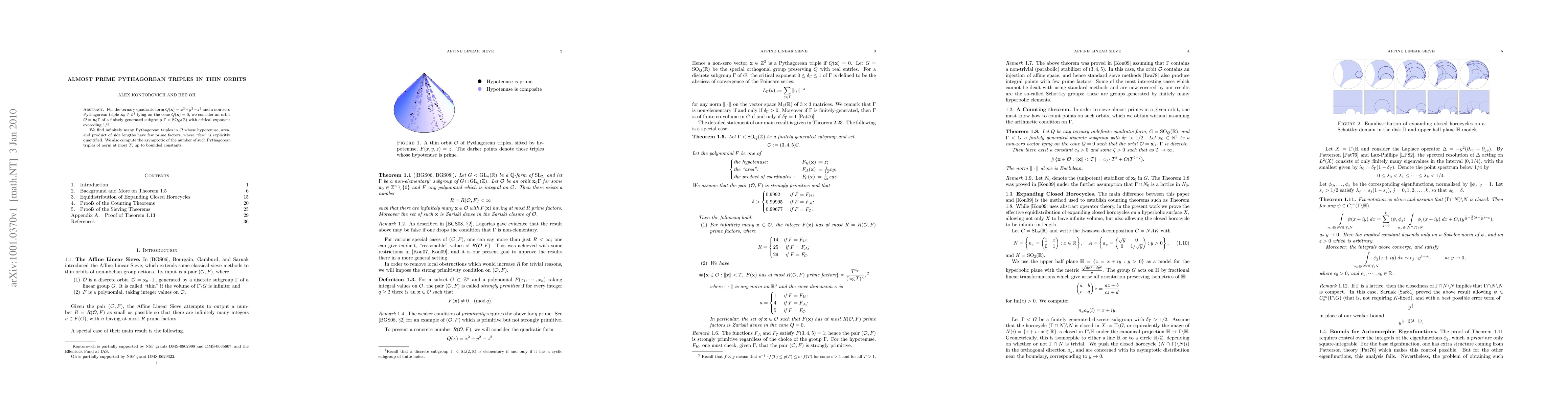 For the ternary quadratic form Q(x) = x^2 + y^2 - z^2 and a non-zero Pythagorean triple x_0 in Z^3 lying on the cone Q(x) = 0, we consider an orbit O = x_0 Gamma of a finitely generated subgroup Gamma < SO_Q(Z) with critical exponent exceeding 1/2. We find infinitely many Pythagorean triples in O whose hypotenuse, area, and product of side lengths have few prime factors, where "few" is explicitly quantified. We also compute the asymptotic of the number of such Pythagorean triples of norm at most T, up to bounded constants.