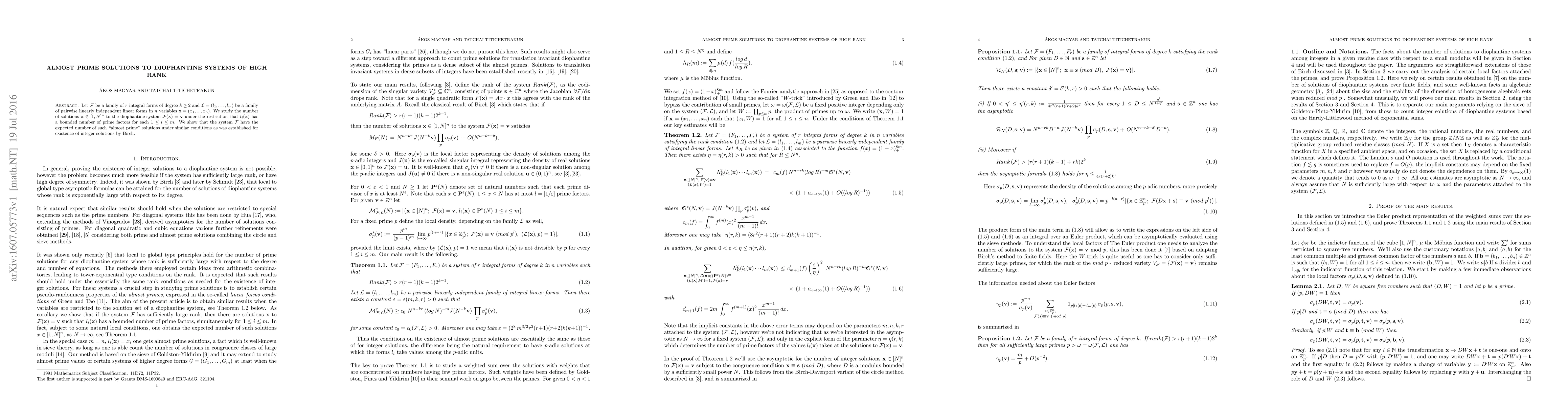 Let $\F$ be a family of $r$ integral forms of degree $k\geq 2$ and $\LL=(l_1,\ldots,l_m)$ be a family of pairwise linearly independent linear forms in $n$ variables $\x=(x_1,...,x_n)$. We study the number of solutions $\x\in[1,N]^n$ to the diophantine system $\F(\x)=\vv$ under the restriction that $l_i(\x)$ has a bounded number of prime factors for each $1\leq i\leq m$. We show that the system $\F$ have the expected number of such "almost prime" solutions under similar conditions as was established for existence of integer solutions by Birch.