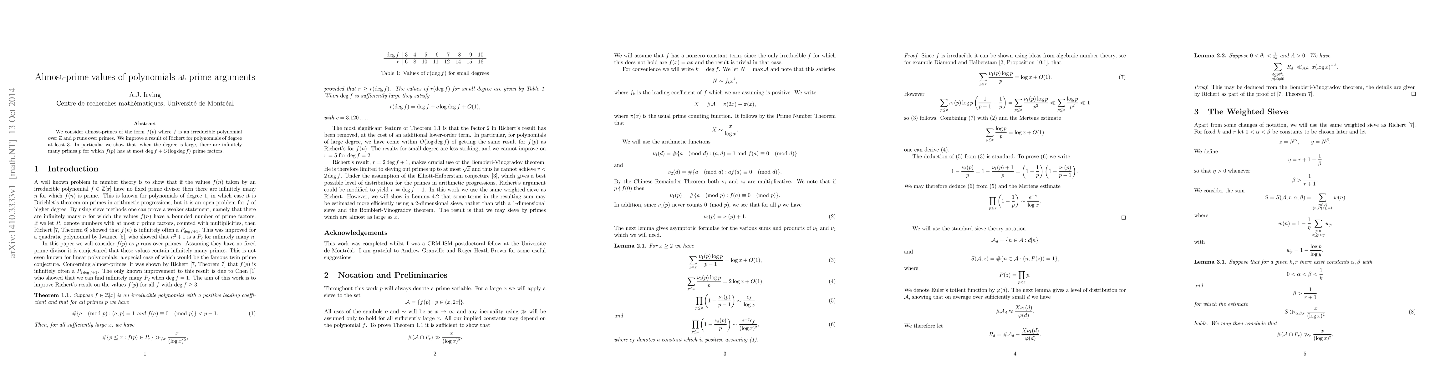 This paper improves upon Richert's result regarding the almost-prime values of irreducible polynomials evaluated at prime arguments, demonstrating that for sufficiently large degrees, there are infinitely many primes where the polynomial's value has a bounded number of prime factors.
