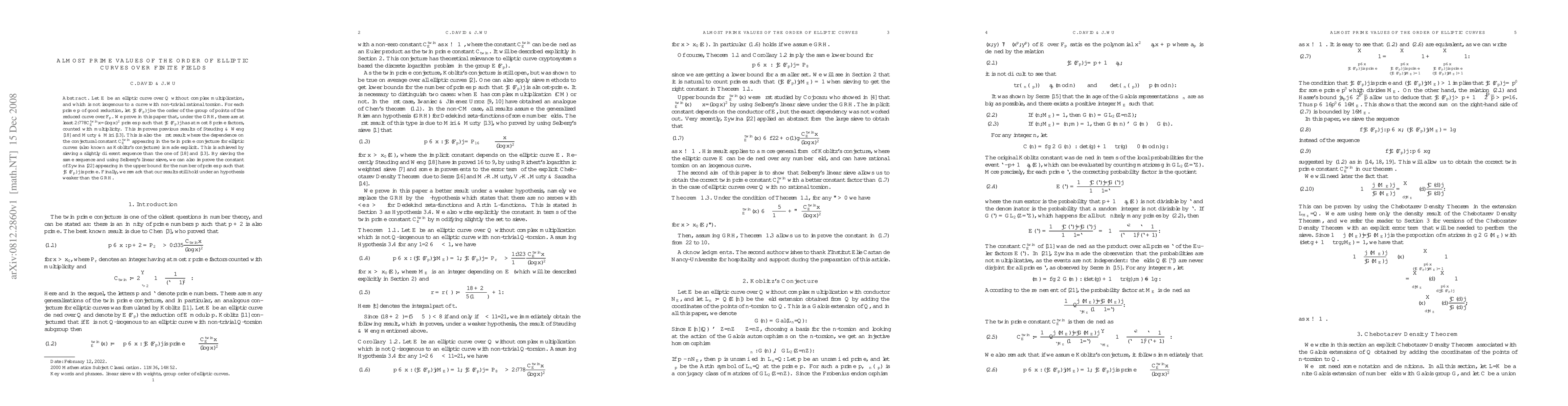 This paper proves that under the Generalized Riemann Hypothesis, there are at least $2.778 C_E^{\rm twin} x / (\log{x})^2$ primes $p$ for which the order of elliptic curve points over finite fields has at most 8 prime factors, improving previous results. The study also explicitly links the result to Koblitz's conjecture on twin primes for elliptic curves.