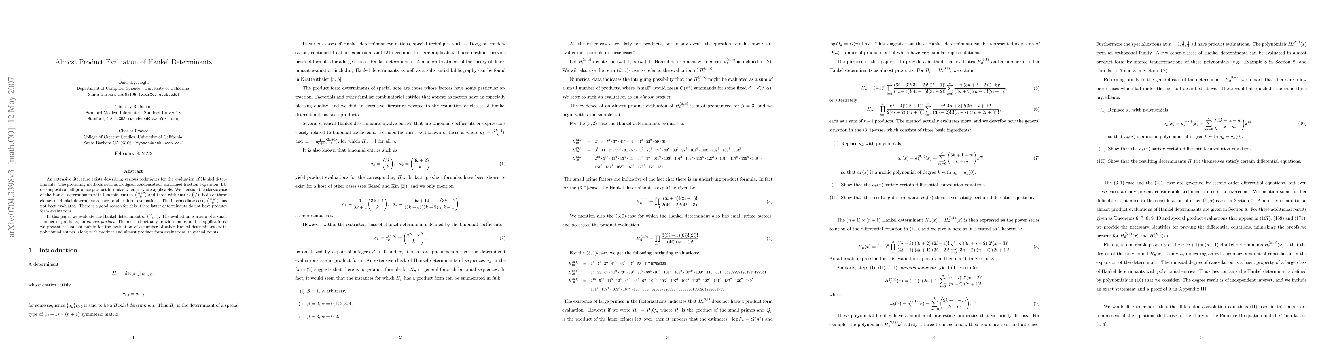 An extensive literature exists describing various techniques for the evaluation of Hankel determinants. The prevailing methods such as Dodgson condensation, continued fraction expansion, LU decomposition, all produce product formulas when they are applicable. We mention the classic case of the Hankel determinants with binomial entries ${3k+2 \choose k}$ and those with entries ${3k \choose k}$; both of these classes of Hankel determinants have product form evaluations. The intermediate case, ${3k+1 \choose k}$ has not been evaluated. There is a good reason for this: these latter determinants do not have product form evaluations. In this paper we evaluate the Hankel determinant of ${3k+1 \choose k}$. The evaluation is a sum of a small number of products, an almost product. The method actually provides more, and as applications, we present the salient points for the evaluation of a number of other Hankel determinants with polynomial entries, along with product and almost product form evaluations at special points.