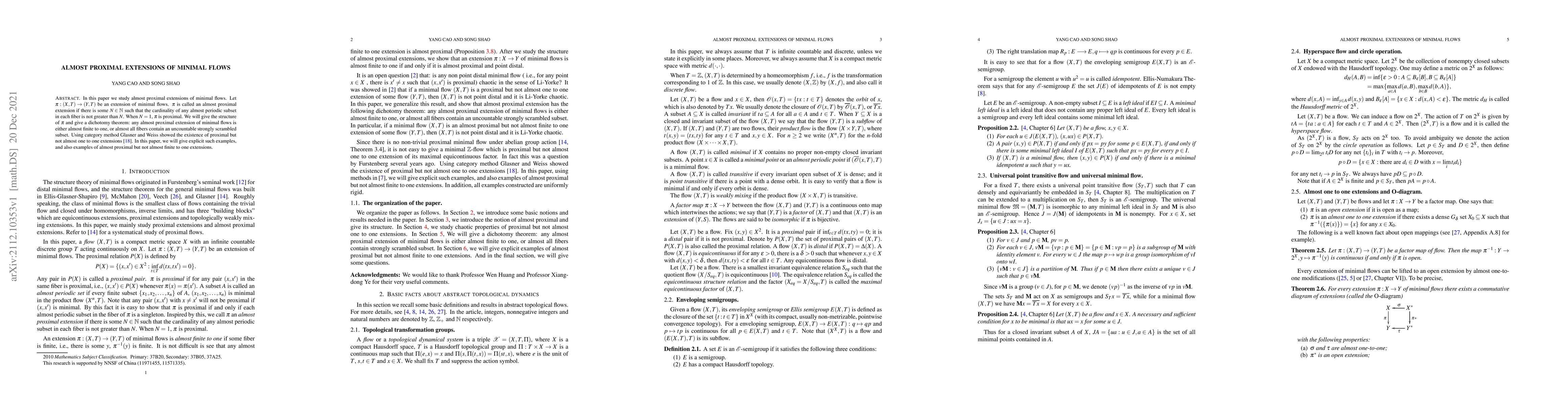 In this paper we study almost proximal extensions of minimal flows. Let $\pi: (X,T)\rightarrow (Y,T)$ be an extension of minimal flows. $\pi$ is called an almost proximal extension if there is some $N \in \mathbb{N}$ such that the cardinality of any almost periodic subset in each fiber is not greater than $N$. When $N=1$, $\pi$ is proximal. We will give the structure of $\pi$ and give a dichotomy theorem: any almost proximal extension of minimal flows is either almost finite to one, or almost all fibers contain an uncountable strongly scrambled subset. Using category method Glasner and Weiss showed the existence of proximal but not almost one to one extensions [18]. In this paper, we will give explicit such examples, and also examples of almost proximal but not almost finite to one extensions.